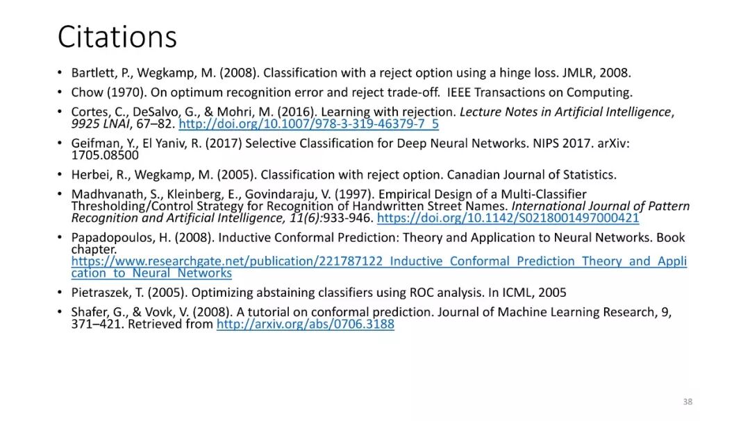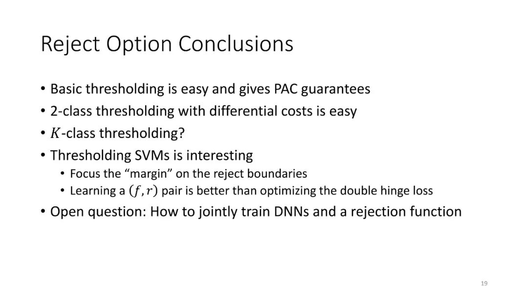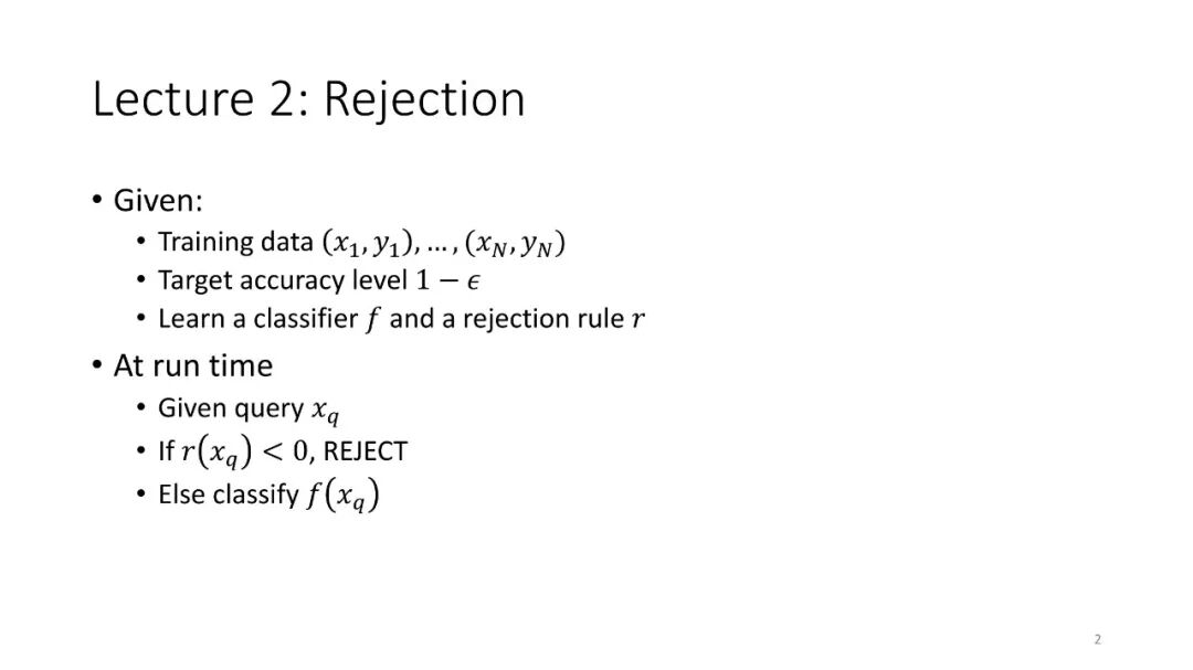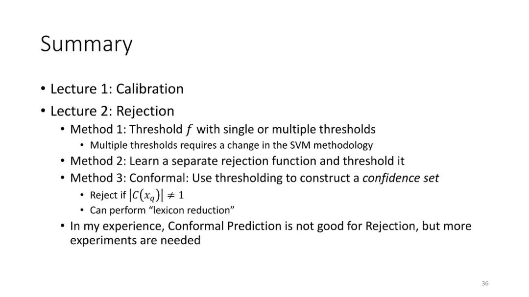 第2讲:带有拒绝选项的分类。为了正确地做出拒绝决策,我们不需要获得经过校准的概率。这节课讨论了设置拒绝阈值的方法,该阈值提供了准确性保证。这包括标准的阈值法和保角预测法。
