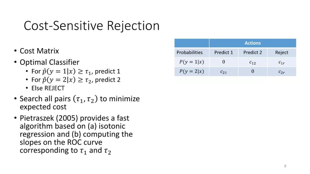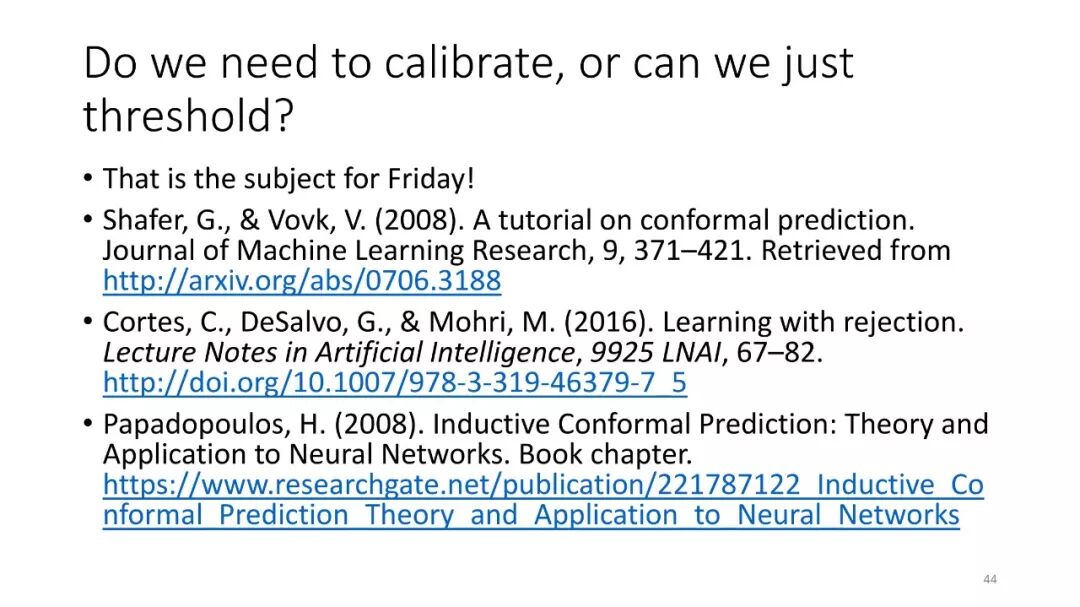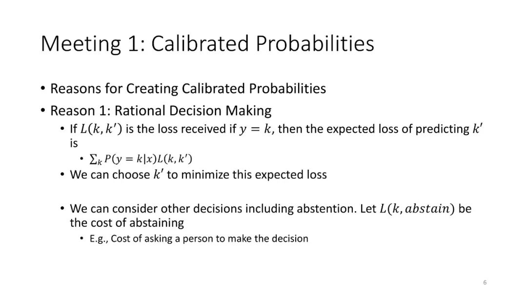 第1讲:校准概率。本节课讨论如何从监督分类器获得校准概率。这对于做出拒绝决定很有用,对于cost-sensitive的分类,处理类不平衡以及作为更大的AI系统的组件也是有用的。