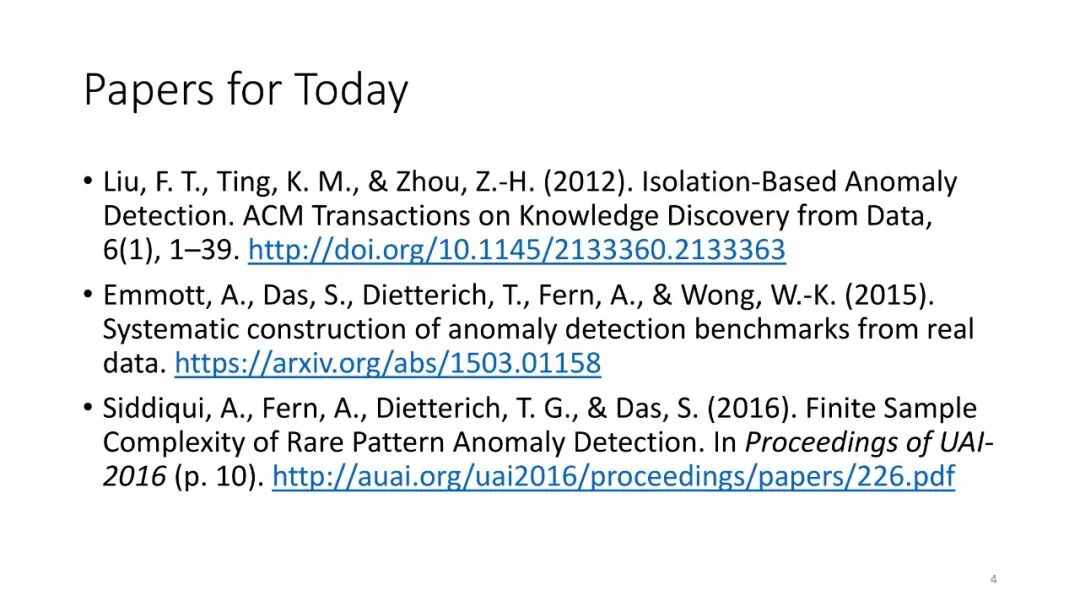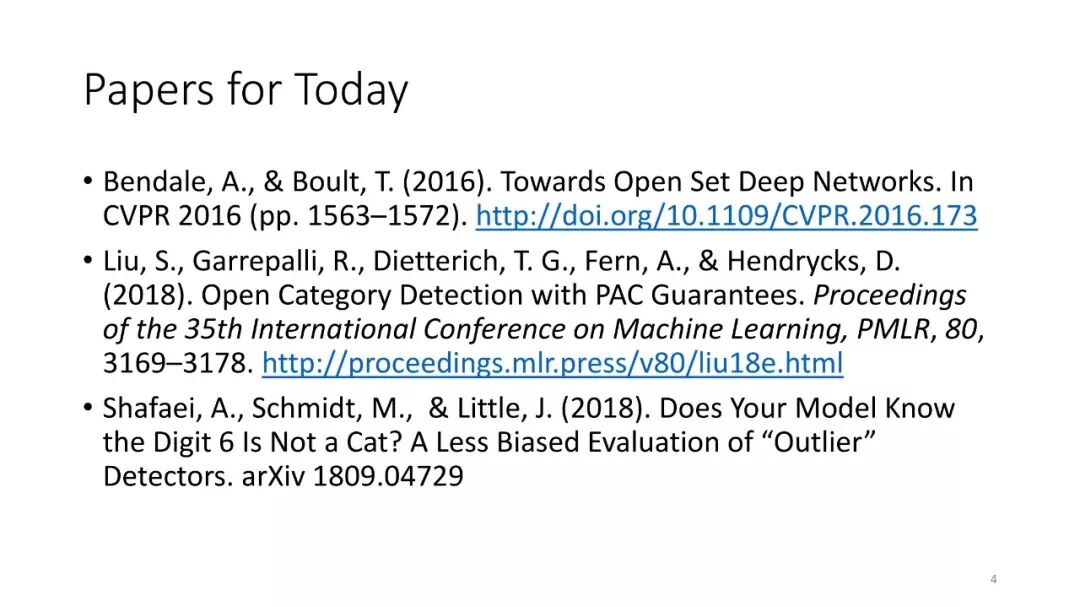 第4讲:异常检测。大多数开放类别方法都使用异常检测方法来进行新奇类查询。本节课讨论了八种异常检测算法的基准研究。然后介绍由Alan Fern,Md.Amran Siddiqui和我开发的罕见模式异常检测理论,该理论给出了异常检测方法的PAC式理论。