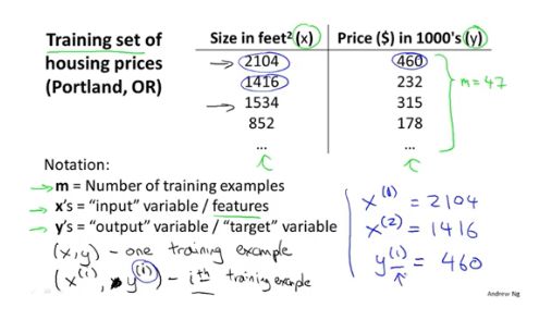 由上图可知,可以用线性函数去拟合图中所标的数据集,假设对于房子size和price的数据集如下,在我们构建的模型中,我们通常这样设置参数:
