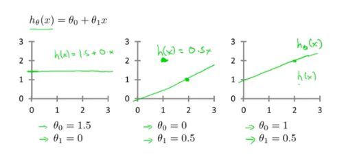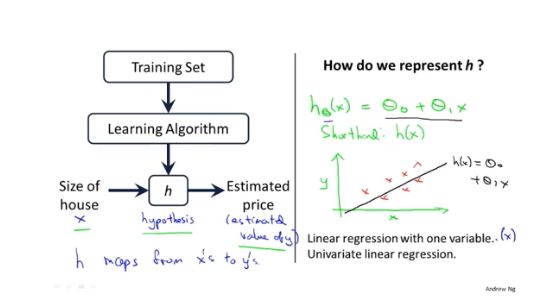 给定一个训练集,算法要输出一个假设函数h,实现,输入房子size,输出房子的预计价格,即h是一个x映射到y的函数,关键是怎么选择这个假设函数。