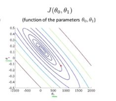 正如上图所示,只有一个参数时,线性拟合的代价函数近似为一条抛物线,而未简化时,拥有两个参数,此时的代价函数如下图所示,是类似“碗”的三维图形,利用等高线的概念,可以映射为如下右图的形式: