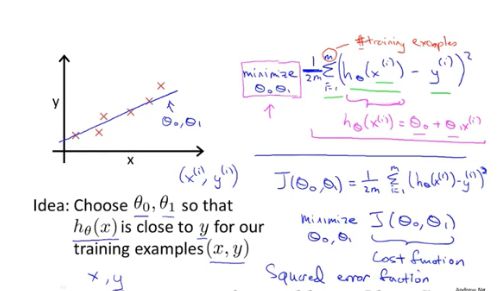 将图中横线上半部分的式子,表示为下半部分的两个式子,其中就是前面提到的代价函数(cost function),以后会经常提到和用到。