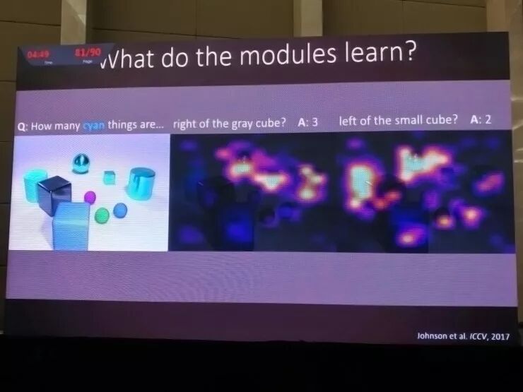 而在ICCV上,他们介绍了新一篇论文中的成果。借助新的CLEVR数据集,把一个问题分解成带有功能的程序段,然后在程序段基础上训练一个能回答问题的执行引擎。这个方案在尝试推理真实世界问题的时候就具有高得多的组合能力。