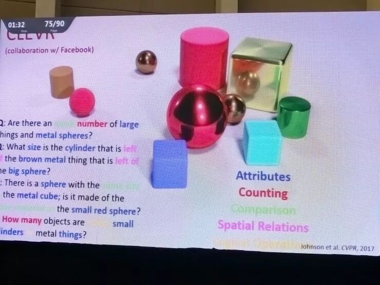 李飞飞团队和Facebook合作重新研究这类问题,创造了带有各种几何体的场景,然后给人工智能提问,看它会如何理解、推理、解决这些问题。这其中会涉及到属性的辨别、计数、对比、空间关系等等。