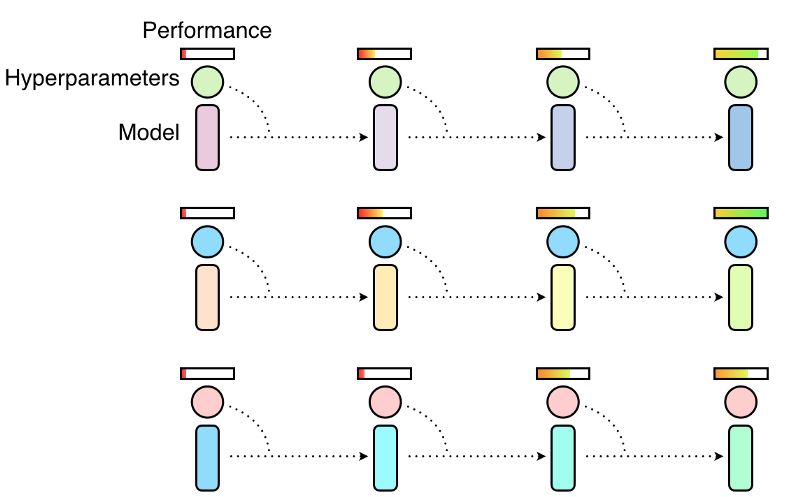 基于群体的训练(PBT)使用类似随机搜索那样的方法来对超参数和权重初始化进行随机采样。与传统方法不同,PBT会异步训练然后定期评估模型性能。如果群体中的一个模型表现不佳,它将评估其余的模型,并用更优化的模型取而代之。同时,在继续训练之前,PBT将在群体中表现的更好的模型的超参的基础上再做修改.