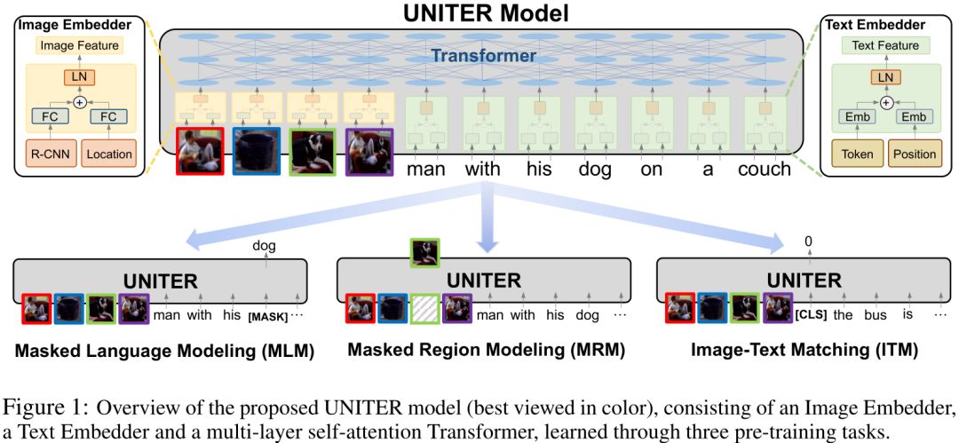 UNITER的模型架构如图1所示。给定一对图像和句子,UNITER将图像的视觉区域和句子的文本标记作为输入。我们设计了一个图像嵌入器和一个文本嵌入器来提取它们各自的嵌入。然后,将这些嵌入信息输入到一个多层自我注意力机制的Transformer中,以了解视觉区域和文本标记之间的交叉模式上下文的嵌入。其中由于Transformer中的自我注意力机制是无序的,因此有必要明确地将标记/区域的位置编码作为为附加的输入。