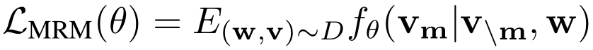 掩码语言模型 (MLM) 我们将图像区域表示为v = {v_1,…, v_k},将输入单词表示为w = {w_1,…,w_T},掩码指数为m属于 N_M。在MLM中,我们随机掩码输入中15%的单词,用特殊的标记[MASK]代替w_m。目标是通过观察掩码单词的周围的单词w_\m和整个图像区域v,通过最小化负对数似然来预测这些掩码单词: