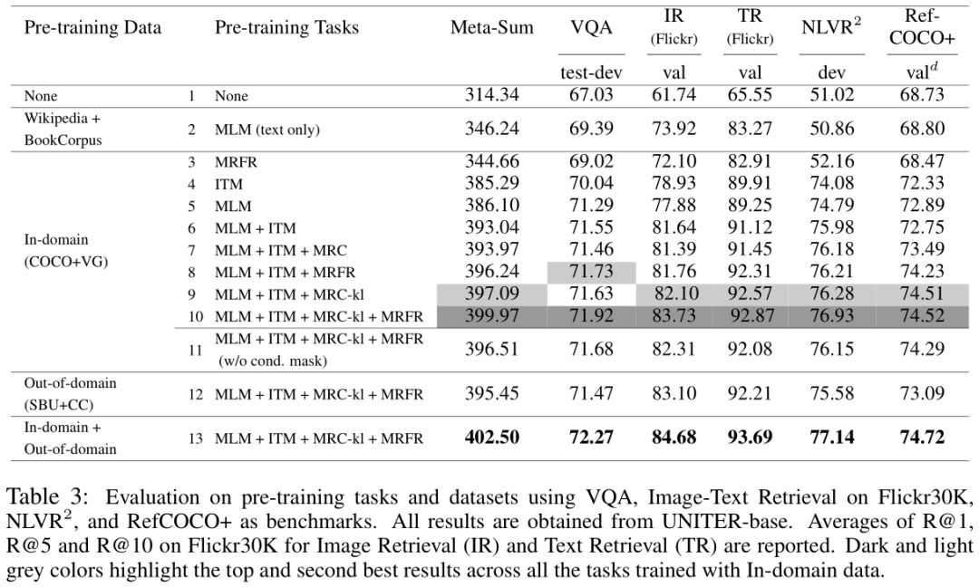首先,我们建立了两个基线:表3中的第1行(L1)表示不涉及预训练,L2显示了使用Devlin等人(2019)的预训练权重初始化的MLM的结果。虽然在预训练MLM只训练文本没有吸收任何图像信息,我们看到了约+30 Meta-Sum超过了L1。因此,我们使用L2中预先训练好的权值来初始化我们的模型,以进行接下来的实验。