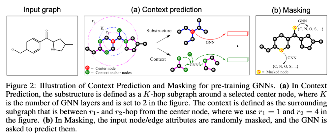 对于用预训练模型在节点级别(比如节点分类)和图级别(比如图分类)捕捉结构和领域知识,作者们都在论文中提出了有价值的见解,那就是,对于在节点级别学习结构属性来说,内容预测任务的重点是在负采样的帮助下根据嵌入预测一个节点周边的节点(仿佛很像word2vec的训练对不对),其中通过掩蔽的方式,随机遮住一些节点/边的属性,然后让网络预测它们。