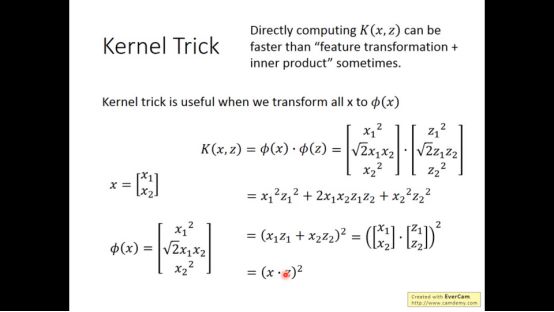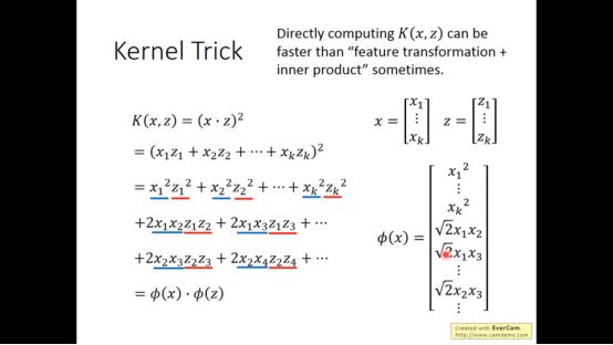 而(x·z)^2可以直接表示feature transformation+inner product,kernel trick更简单更快。