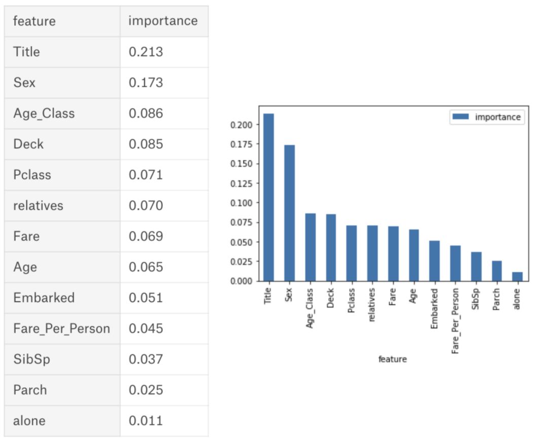 下面你可以看到一个表格和一个可视化图表,显示了13个特征的重要性,我在我的监督分类项目中使用了kaggle上著名的Titanic数据集。