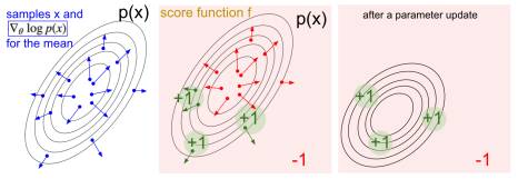 图解翻译:使用score function估计梯度的可视化。左:高斯分布下的一些采样(蓝点),针对每一个蓝点也画出了根据高斯分布均值得到的概率对数的梯度。箭头指示的方向是能够增加该采样点采样概率的分布的均值(对于高斯分布来说,是等值线的中心点)移动的方向;中:大多数采样点对应的score function值是-1,除了一小块区域是+1(score function可以是任意、并且不要求可微的标量函数),此时箭头用不同颜色表示,在随后的更新中,我们将要把所有绿色的值和负的红色值进行平均来更新分布参数(均值);右:参数更新后,绿色箭头的方向和红色箭头的反方向推动了行程均值朝着左下方移动的新的高斯分布,从这个新分布的采样将会按照预期有一个较高的score。