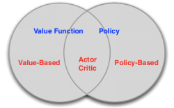 比较了Value-Based和Policy-Based的强化学习,指出前者通过学习价值函数指导策略制定(例如Ɛ-greedy执行方法);后者则没有价值函数,直接学习策略;还有一种既学习价值函数也学习策略的方法,叫Actor-Critic强化学习,本讲稍后会讲解它。