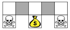 再举一个例子:在下图的格子世界中,个体需要避免碰到骷髅而尽可能找到钱袋子。在上方的5个格子组成的“长廊”中,当以某些对个体来说较容易观测的特征来描述状态空间时,灰色的两个格子将会是无法区分的。