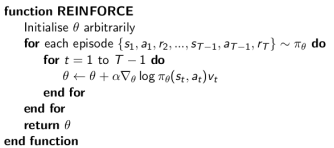 从t=1到t=T-1间的每一个时刻,计算个体获得的收获 ,然后更新参数θ。如此然后重复每一个Episode,直到结束。具体算法如下: