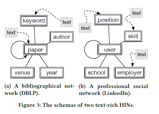 给定HINs的类型,网络模型G=(T,R)用于获取HIN中节点类型和边缘类型的元信息。Figure 3a中说明了DBLP网络的模式,其中论文节点可能有来自内容的其他文本信息,而关键字节点可能与维基百科的描述相关。相似的,Figure 3b中的社交网络包括5个节点类型,这些节点包括技能,雇主和职位等。