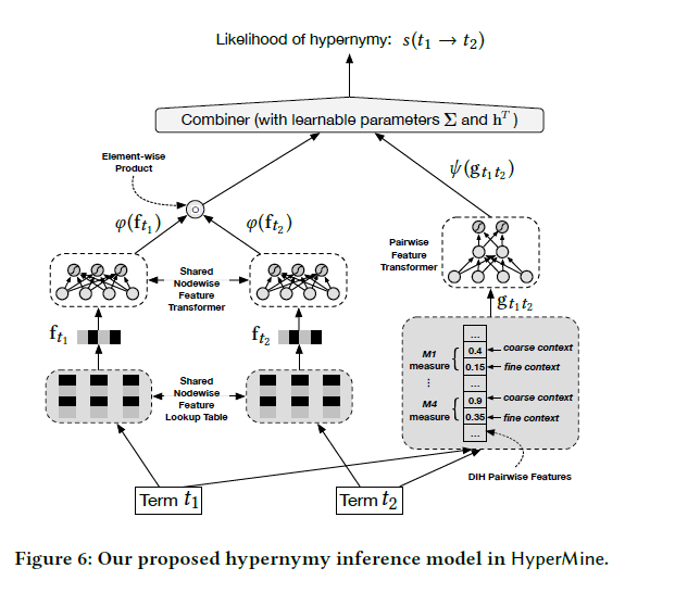 这个模型推测t1与成为t2上位词的可能性,利用高精度模式来获取上位词对,然后用HIN对信息编码并生成多粒度特征。这些特征可以提高召回率。尤其,使用HIN嵌入将网络信号编码为节点特征,并使用DIH在文本粒度上将网络信号编码为成对特征。