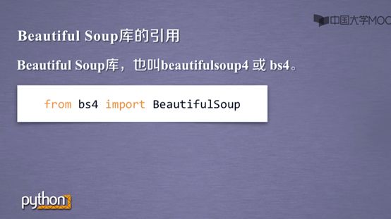 对于Beautiful Soup库的引用,使用指令from bs4 import BeautifulSoup,注意BeautifulSoup 是bs4里面的一个类