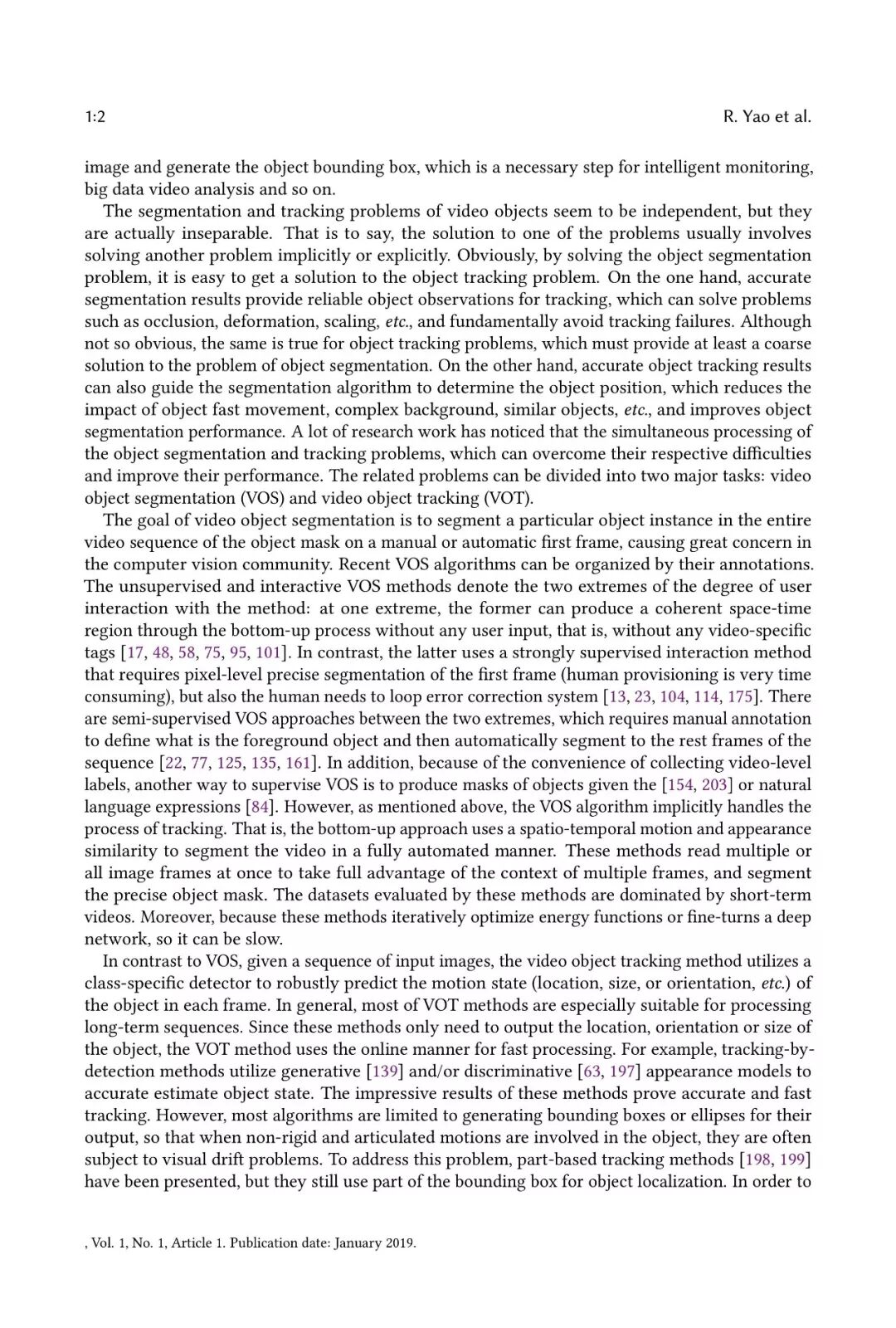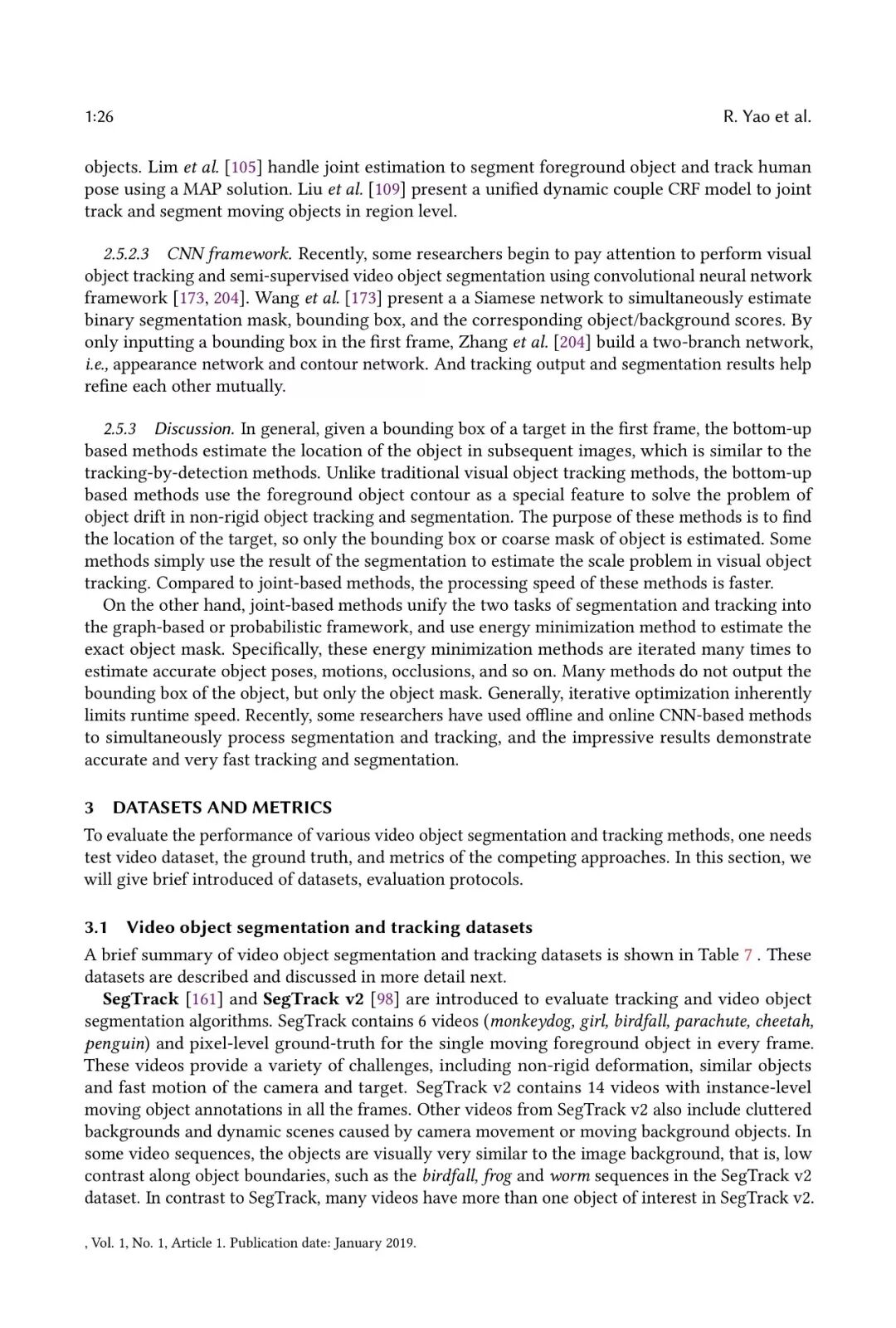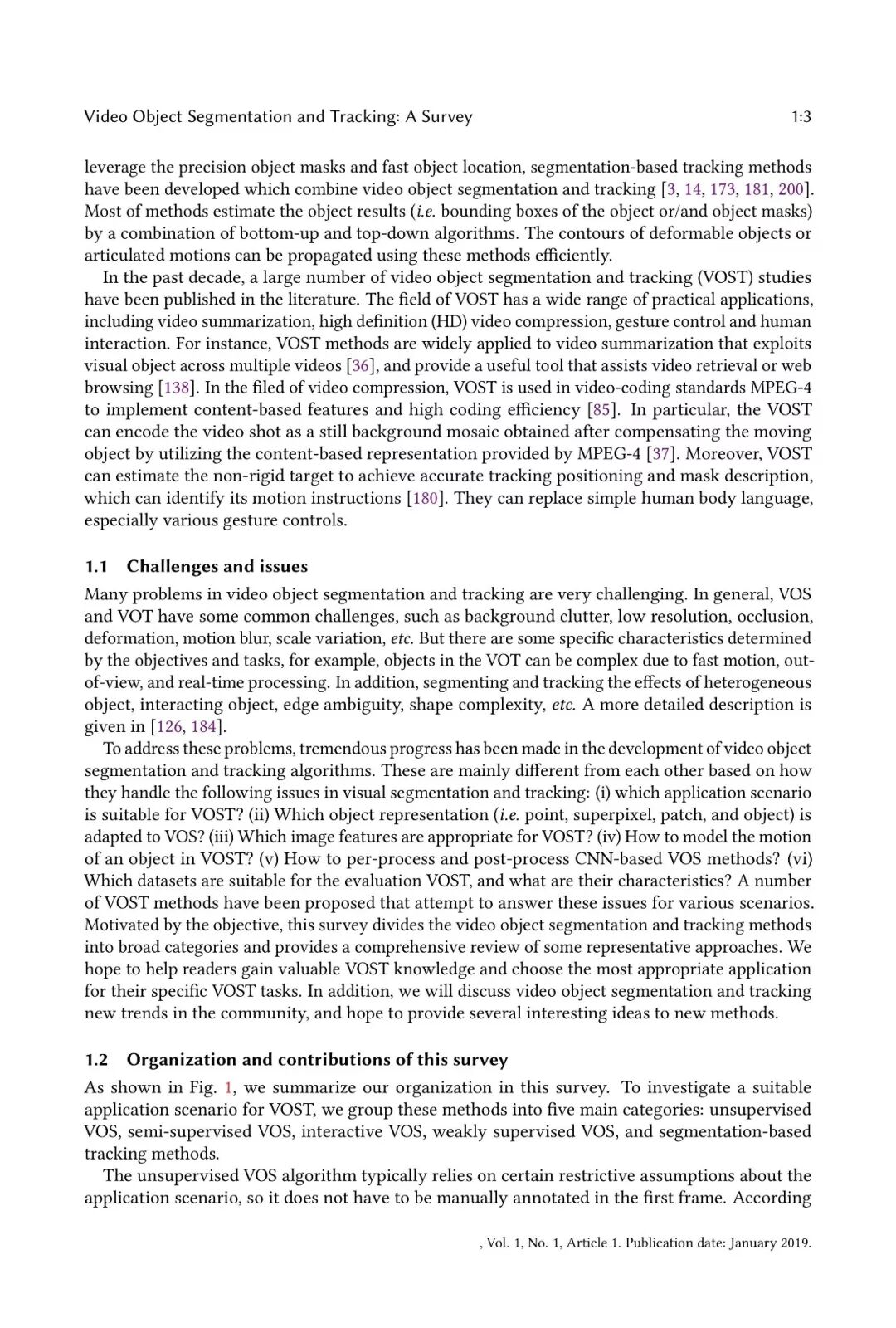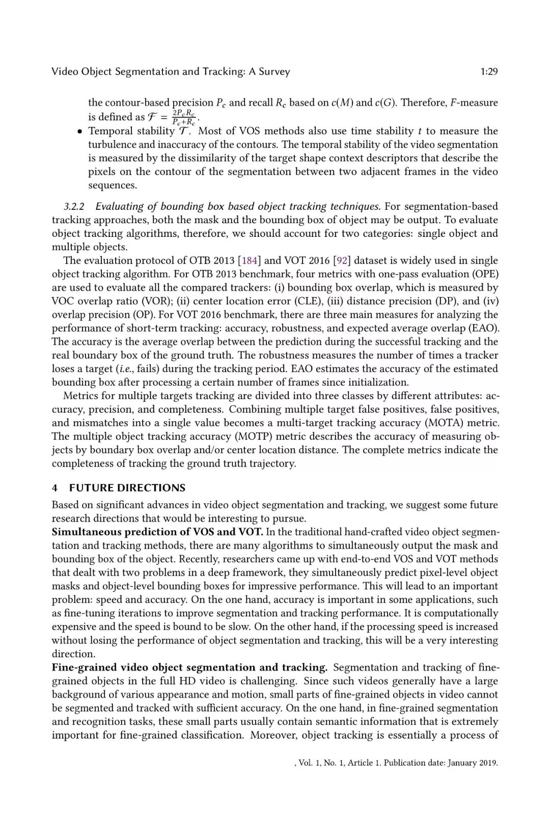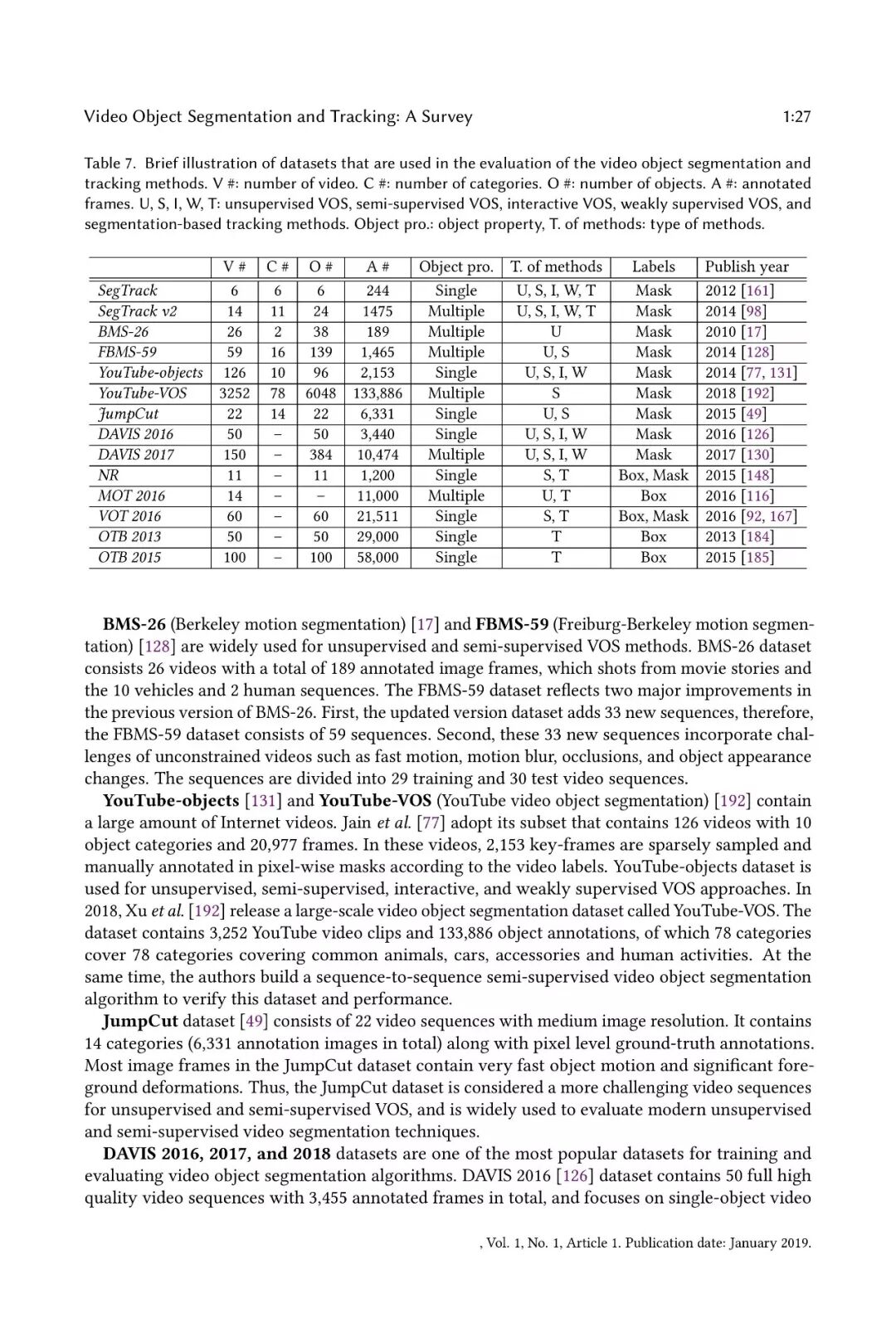在本文中,我们首先提供了现有的分类法,包括无监督视频对象分割、半监督视频对象分割、基于分段的跟踪方法等;其次,我们讨论了不同技术方法,并总结了相关视频数据集,同时整理了各种评估指标;最后,讨论了此类任务未来的发展方向。