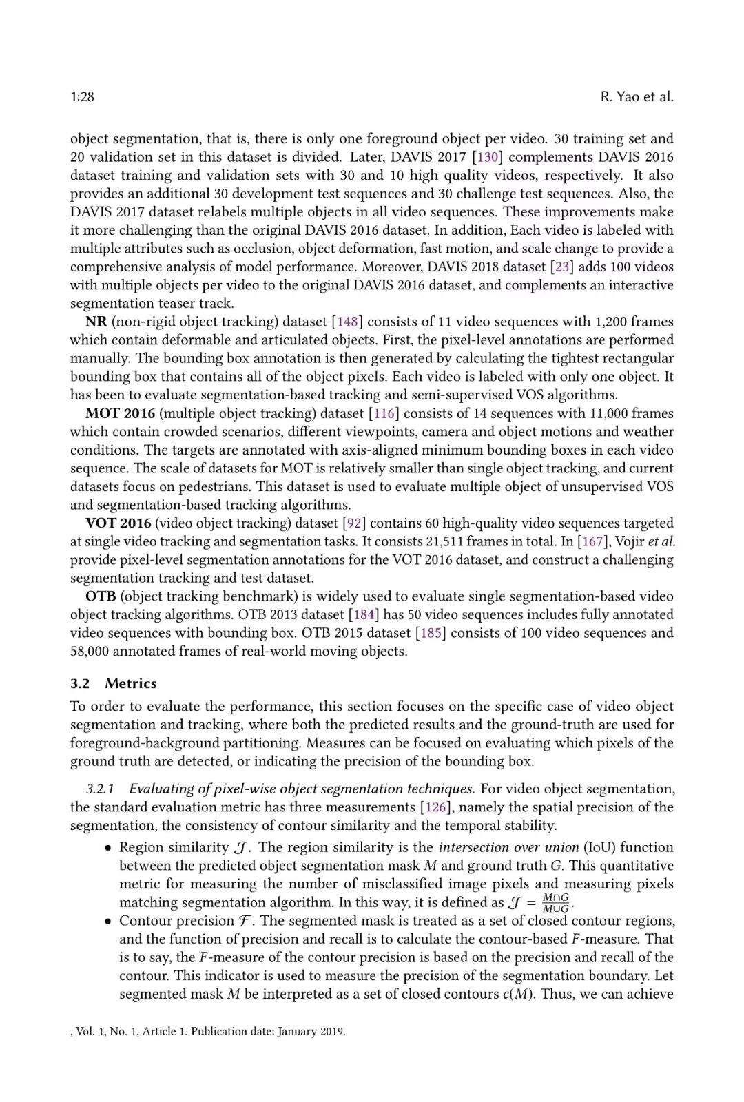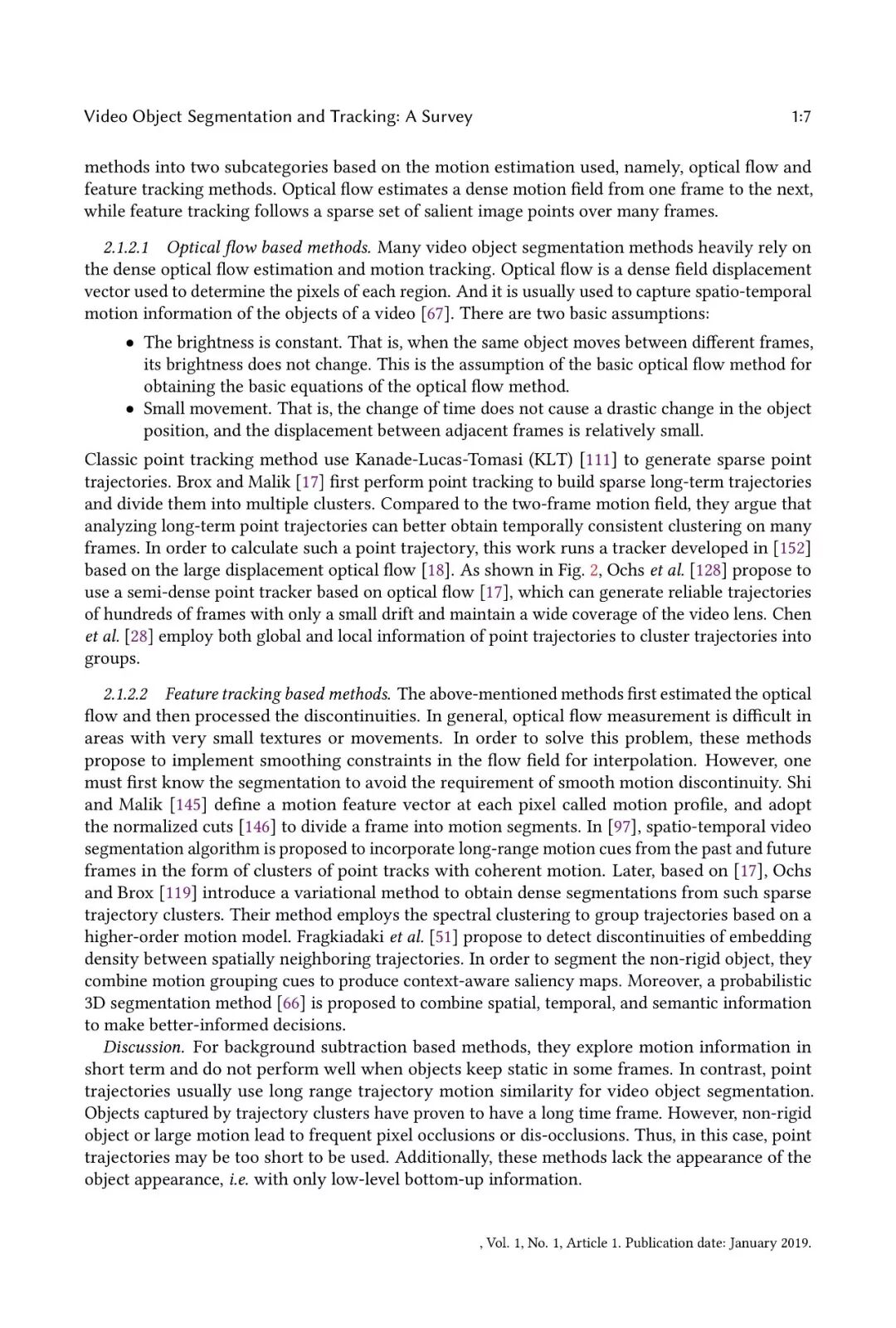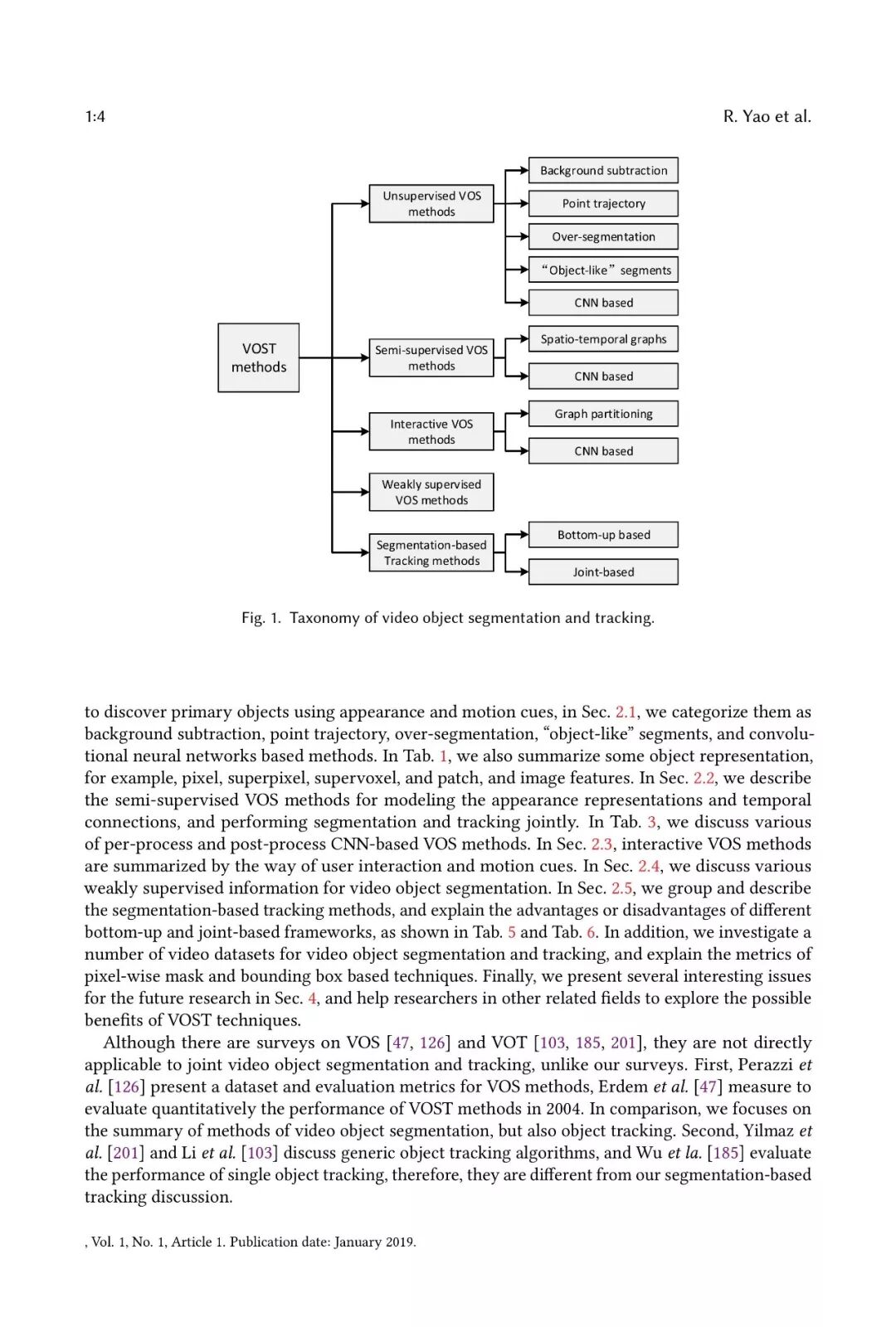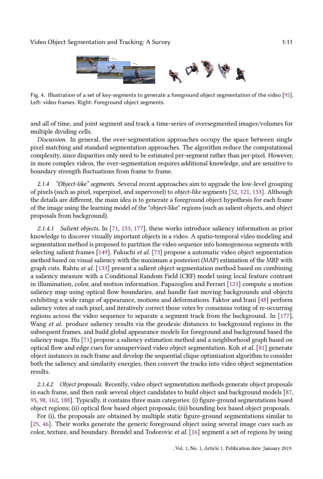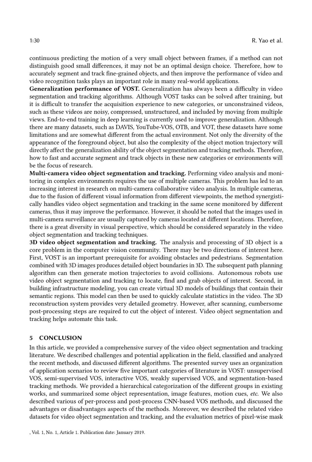 在本文中,我们首先提供了现有的分类法,包括无监督视频对象分割、半监督视频对象分割、基于分段的跟踪方法等;其次,我们讨论了不同技术方法,并总结了相关视频数据集,同时整理了各种评估指标;最后,讨论了此类任务未来的发展方向。