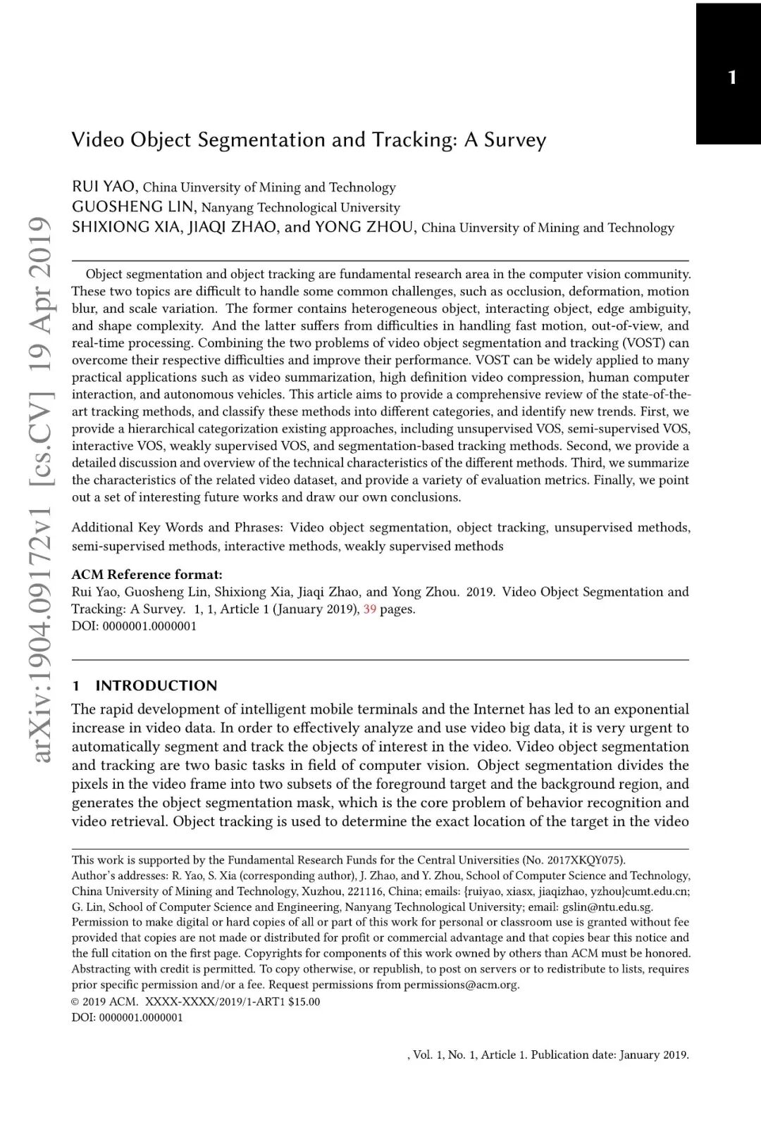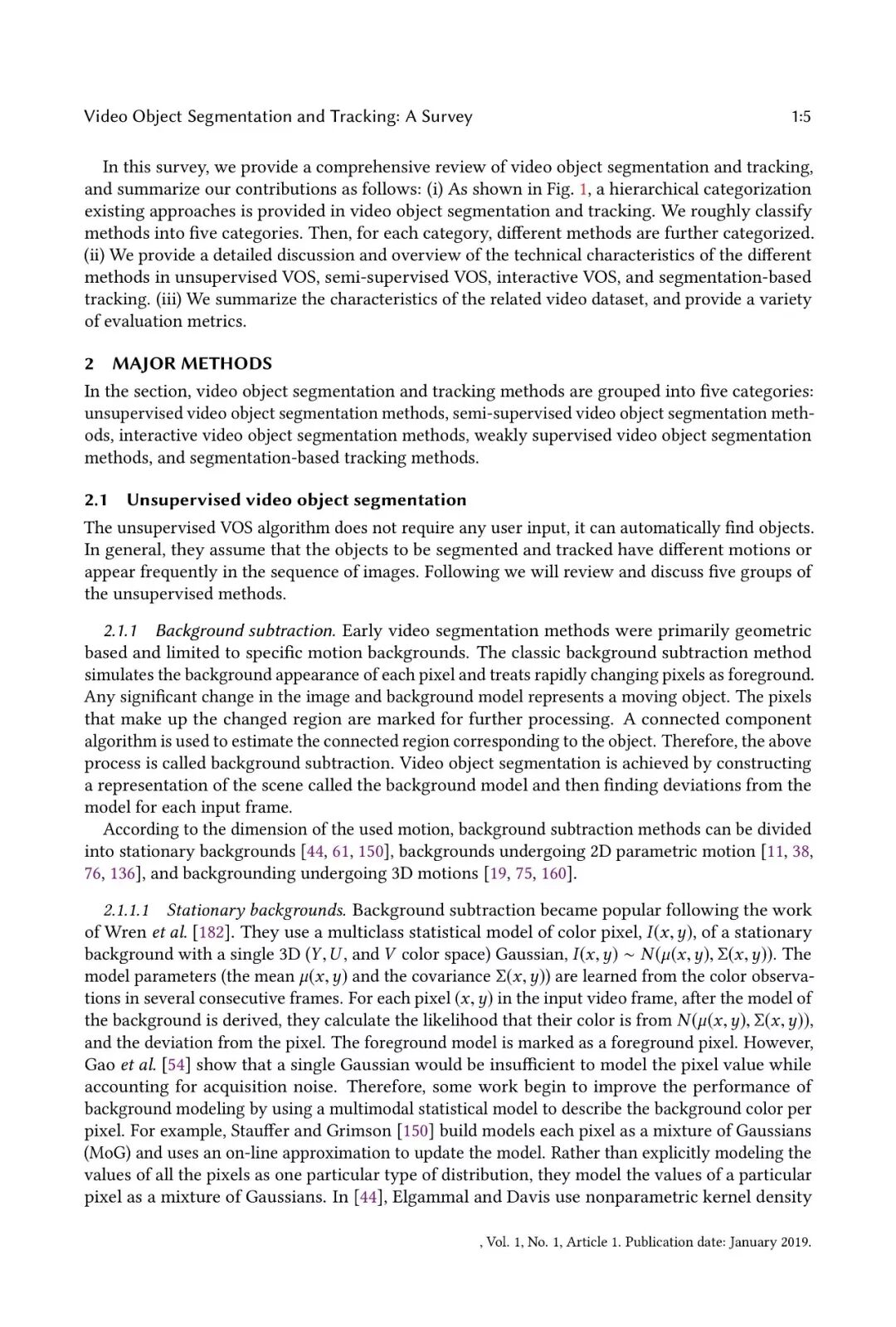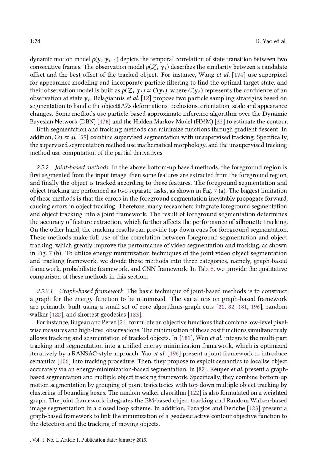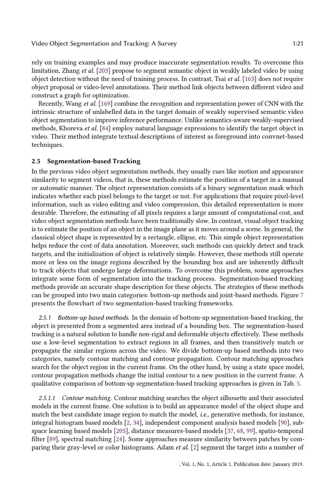 在本文中,我们首先提供了现有的分类法,包括无监督视频对象分割、半监督视频对象分割、基于分段的跟踪方法等;其次,我们讨论了不同技术方法,并总结了相关视频数据集,同时整理了各种评估指标;最后,讨论了此类任务未来的发展方向。
