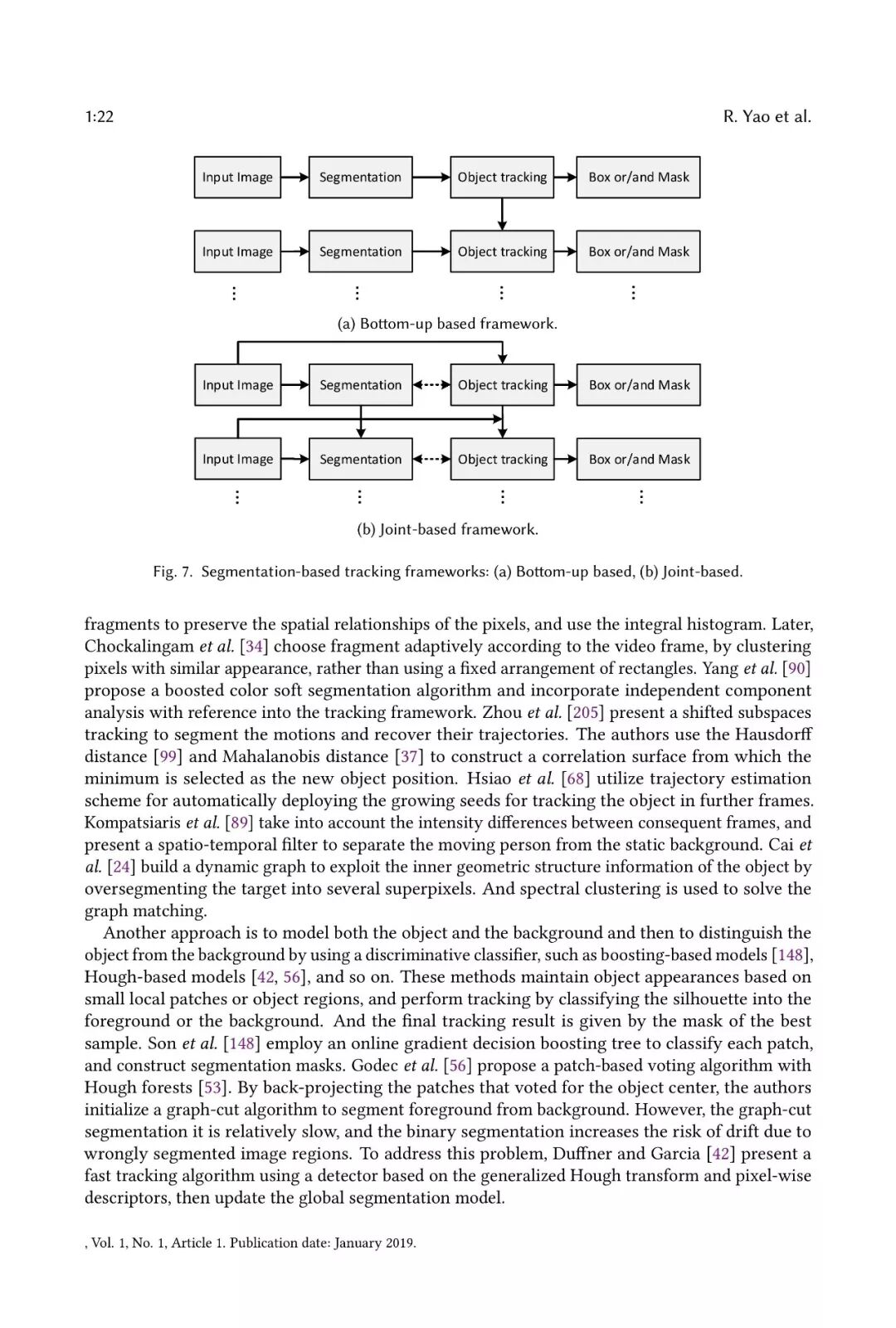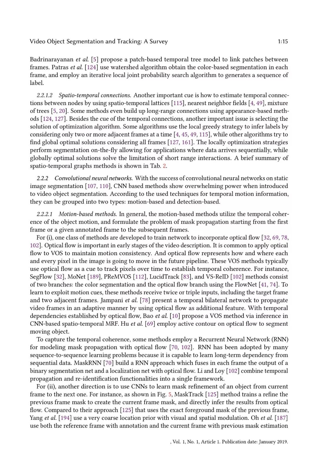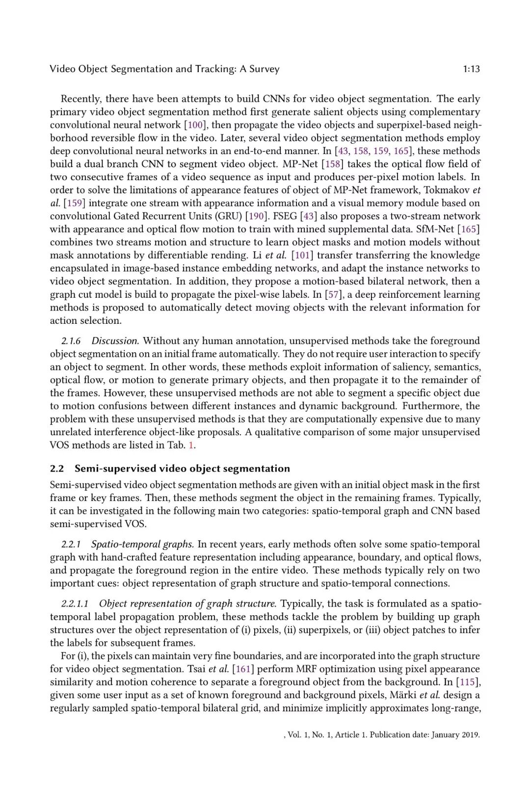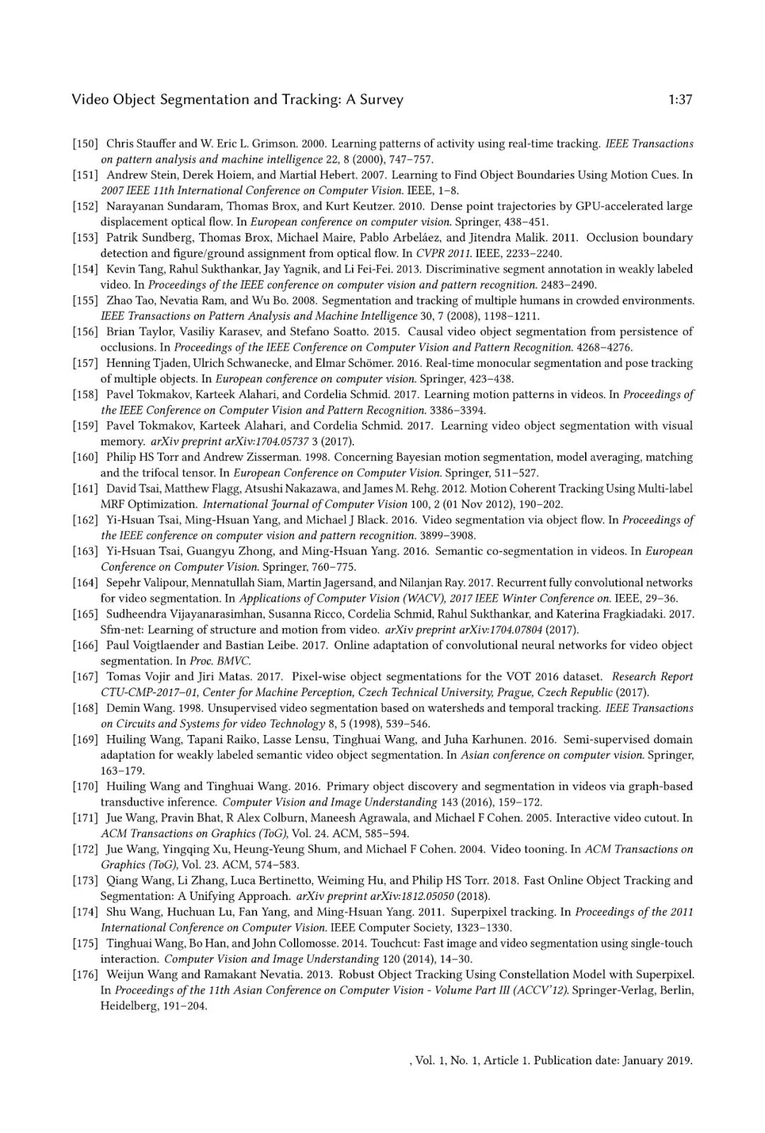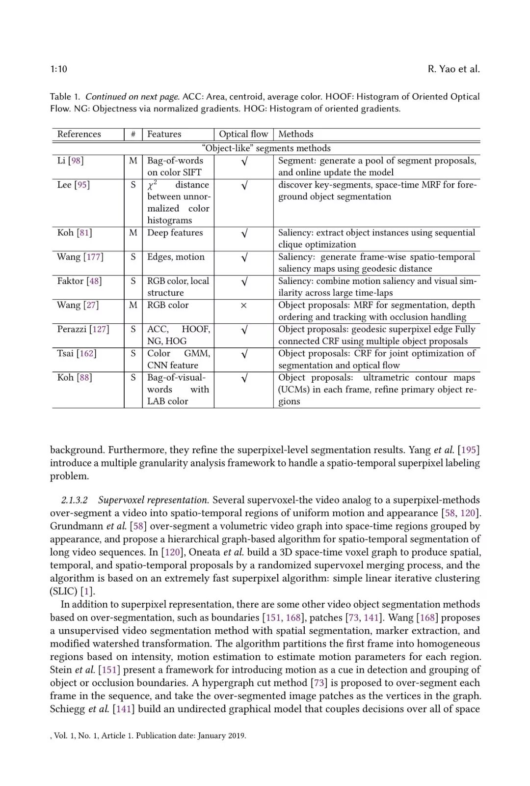 在本文中,我们首先提供了现有的分类法,包括无监督视频对象分割、半监督视频对象分割、基于分段的跟踪方法等;其次,我们讨论了不同技术方法,并总结了相关视频数据集,同时整理了各种评估指标;最后,讨论了此类任务未来的发展方向。