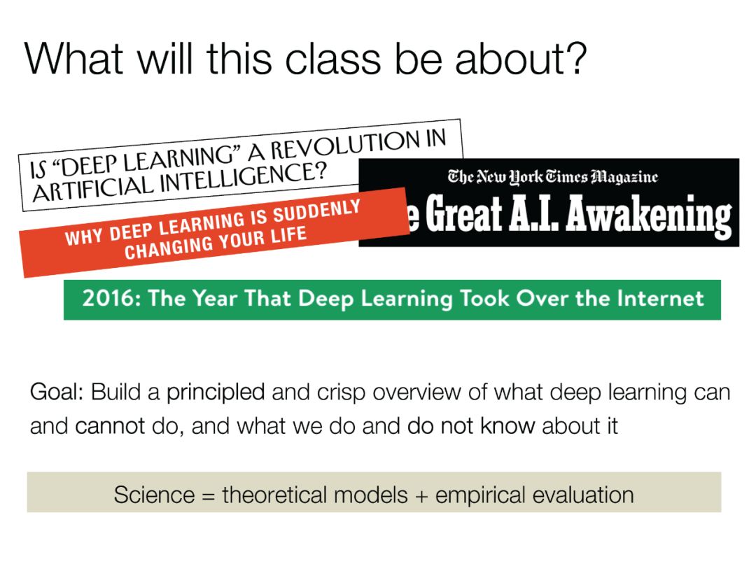 课程计划的目标是解决其中一些已确定的缺点。重点将是通过经验评估和理论建模的结合,建立对深度学习的基本性理解。这些项目旨在作为ML会议后续出版物的起点。