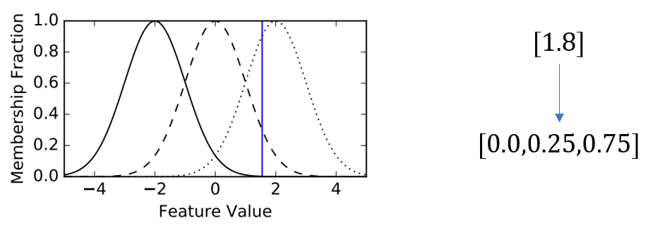 模糊直方图的原理也很简单:预先定义几个特征值区域的边界点为各个高斯分布的均值,并预设好方差。对任一特征值,根据其与各个高斯分布交点的纵坐标作为其落入该区域的数值,然后将所有数值归一化,就得到了该特征值分布在各个区间的比例。举个例子,图上的[1.8]与三个高斯分布的交点分别在0,0.3,0.9处,归一化一下,即可知该特征值最终应该用一个3维向量[0.0, 0.25, 0.75]来表示。