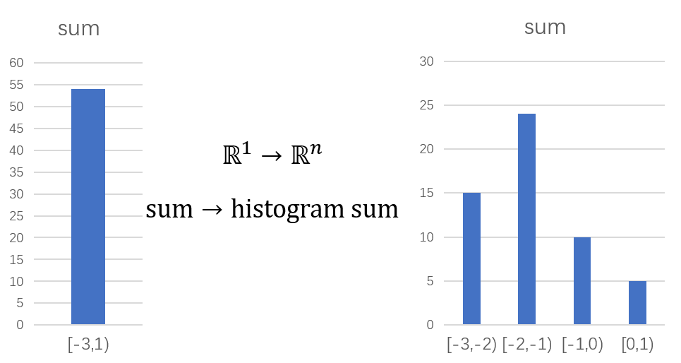 考虑到这一点,文献[1]的作者就提出要用类似直方图的方法来对每维数据分布进行建模。具体而言,请读者先通过下面的对比图来直观感受一下直方图是如何巧妙平衡数据信息的压缩与增强的。假设我们有100个介于[-3,1]的数字,如果我们直接将它们求和,如左图所示,我们完全看不出这100个数据的分布;而如果我们将[-3, 1]等分成4个区域,比如说就是[-3,-2),[-2,-1),[-1,0) 和 [0,1)。我们分开统计各个区域的和,可以发现一点原数据的分布特征,就如下右侧子图所示: