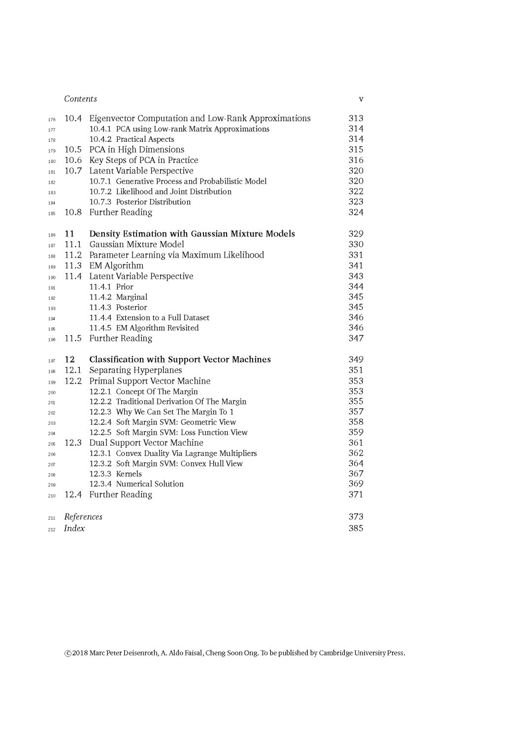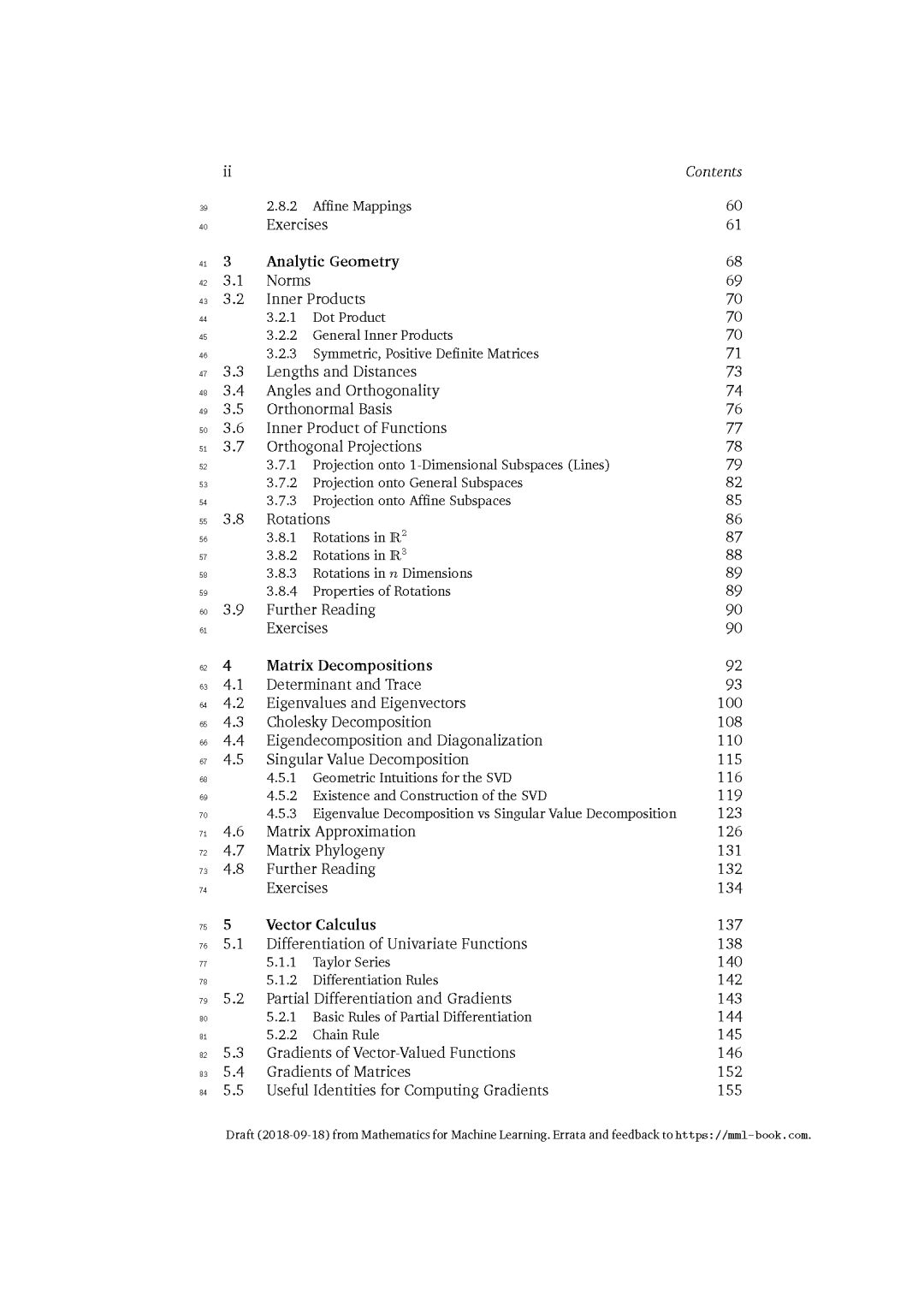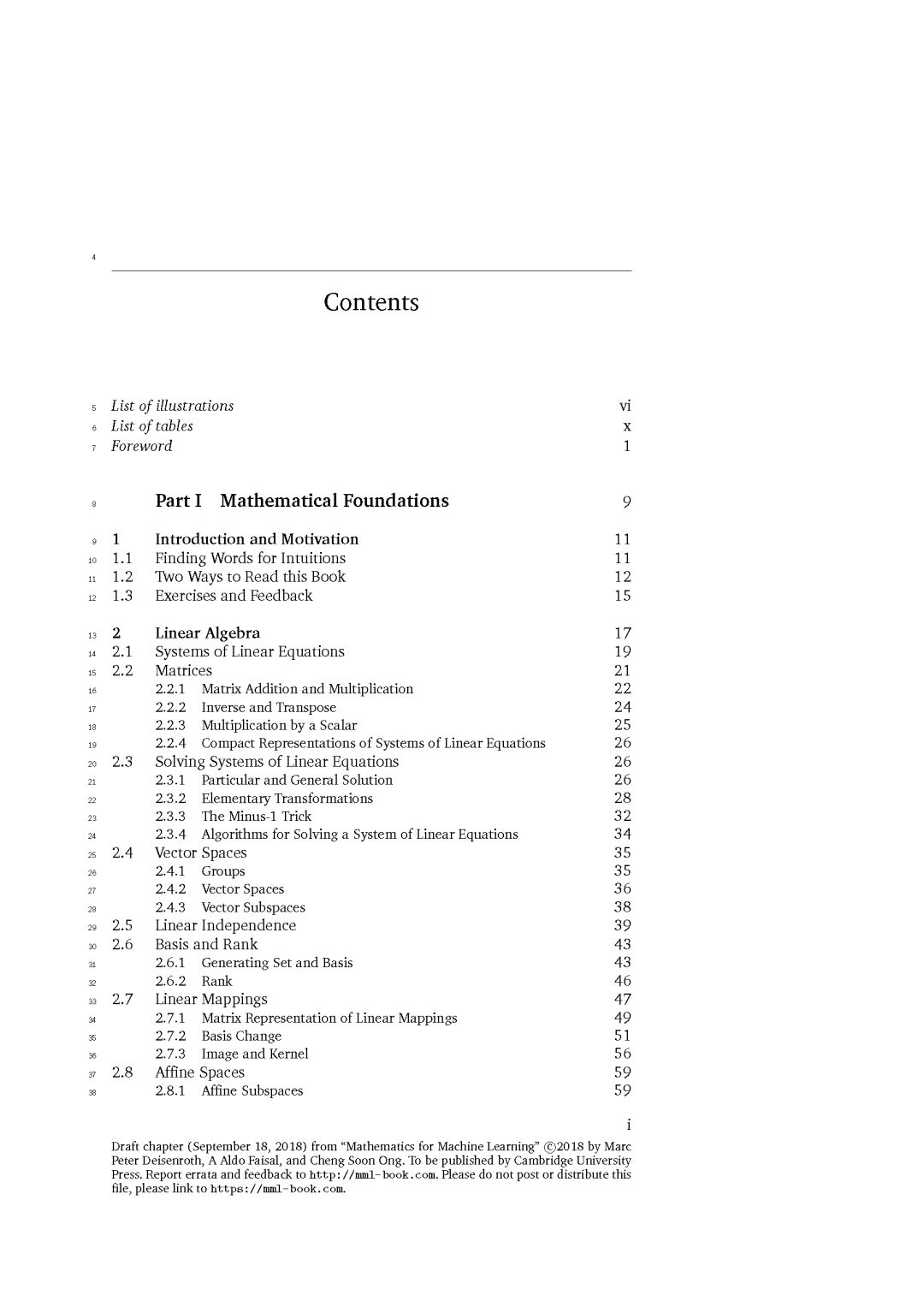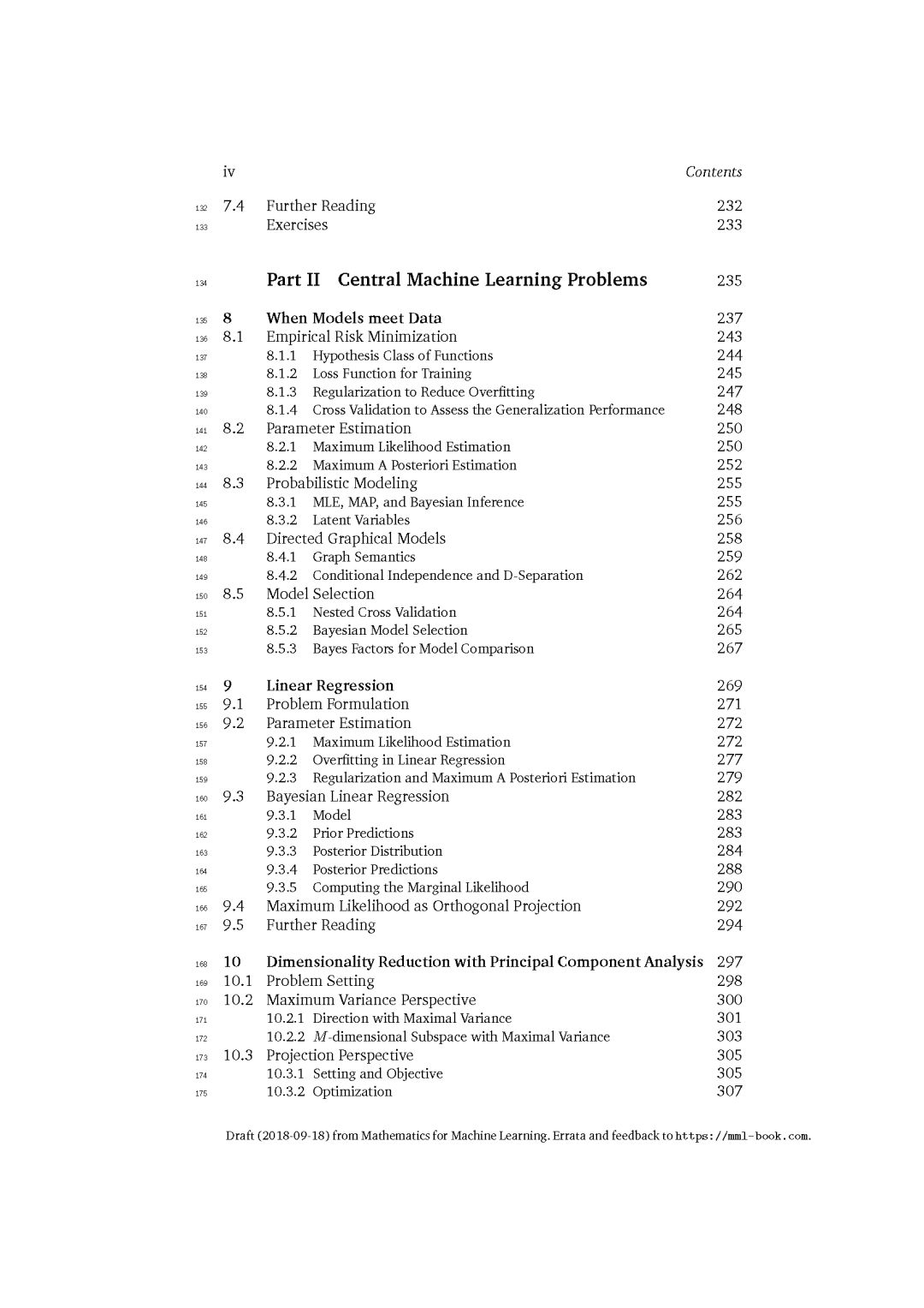 这本书的第一部分描述了关于机器学习系统的三个主要组成部分的数学概念和数学基础:数据、模型和学习。在本书中,作者假设数据已经被适当地转换成适合于阅读的数字表示形式,并被转换成计算机程序。在这本书中,作者认为数据是向量。模型是现实世界的简化版本,它捕获与任务相关的现实世界的各个方面。模型的用户需要理解模型没有捕捉到什么,从而理解模型的局限性。概括起来就是,作者使用领域知识将数据表示为向量。并选择一个合适的模型,要么使用概率方法,要么使用优化方法。采用数值优化的方法,对过去的数据进行学习,目的是它在看不见的数据上表现良好。