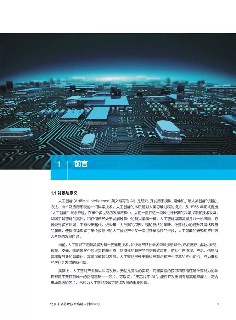 人工智能( Artifical Intelligence,英文缩写为AI,是研究、开发用于模拟、延伸和扩展人类智能的理论、方法、技术及应用系统的一门科学技术。人工智能的本质是对人类思维过程的模拟。从1956年正式提出“人工智能”概念算起,在半个多世纪的发展历程中,人们一直在这一领域进行长期的科学探索和技术攻坚试图了解能的实质,和任何曾经处于发展过程中的新兴学科一样,人工智能早期发展并非一帆风顺,受到多方质疑,不断经历起伏。近些年,大数据的积聚、理论算法的革新、计算能力的提升及网络设施的演进,使得持续积累了半个多世纪的人工智能产业又一次迎来革命性的进步,人工智能的研究和应用进入全新的发展阶段。当前,人工智能正逐渐发展为新一代通用技术,加快与经济社会各领域渗透融合,已在医疗、金融、安防、教育、交通,物流等多个领域实现新业态、新模式和新产品的突破式应用,带动生产流程、产品、信息消费和服务业的智能化、高附加值转型发展。人工智能已处于新科技革命和产业变革的核心前沿,成为推动经济社会发展的新引擎。实际上,人工智能产业得以快速发展,无论是算法的实现、海量数据的获取和存储还是计算能力的体现都离不开目前唯一的物理基础一芯片。可以说,“无芯片不AI",能否开发出具有超高运算能力、符合市场需求的芯片,已成为人工智能领域可持续发展的要因素。