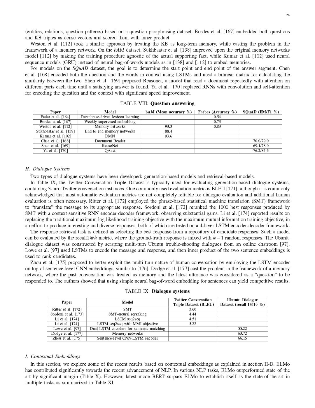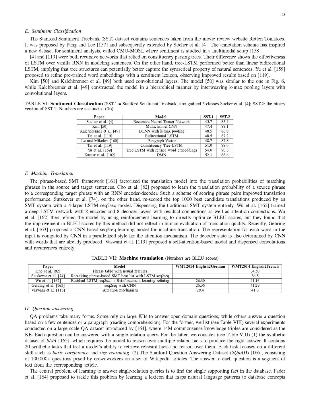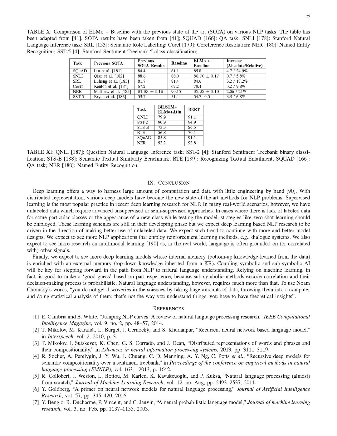 第八部分总结了一系列基于深度学习方法的NLP任务在标准数据集上的性能表现。