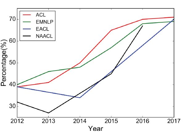 Fig. 1: Percentage of deep learning papers in ACL, EMNLP, EACL, NAACL over the last 6 years (long papers).