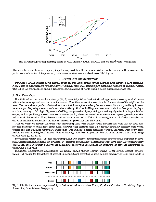 深度学习架构和算法已经在计算机视觉和模式识别等领域取得了令人瞩目的发展。遵循这一趋势,近年来的NLP研究越来越多地关注于使用新的深度学习方法(见图1)。几十年来,针对NLP问题的机器学习方法一直基于在非常高维和稀疏特征上训练浅层模型(如SVM和logistic回归)。近年来,基于密集向量表示的神经网络已经在各种NLP任务中取得了较好的效果。这种趋势是由词嵌入(word embeddings)[2,3]和深度学习方法[4]的成功引发的。深度学习可以实现多层次的自动特征表示学习。相比之下,传统的基于机器学习的NLP系统在很大程度上依赖于人工制作的特性。这些人工制作的功能非常耗时,而且常常是不完整的。