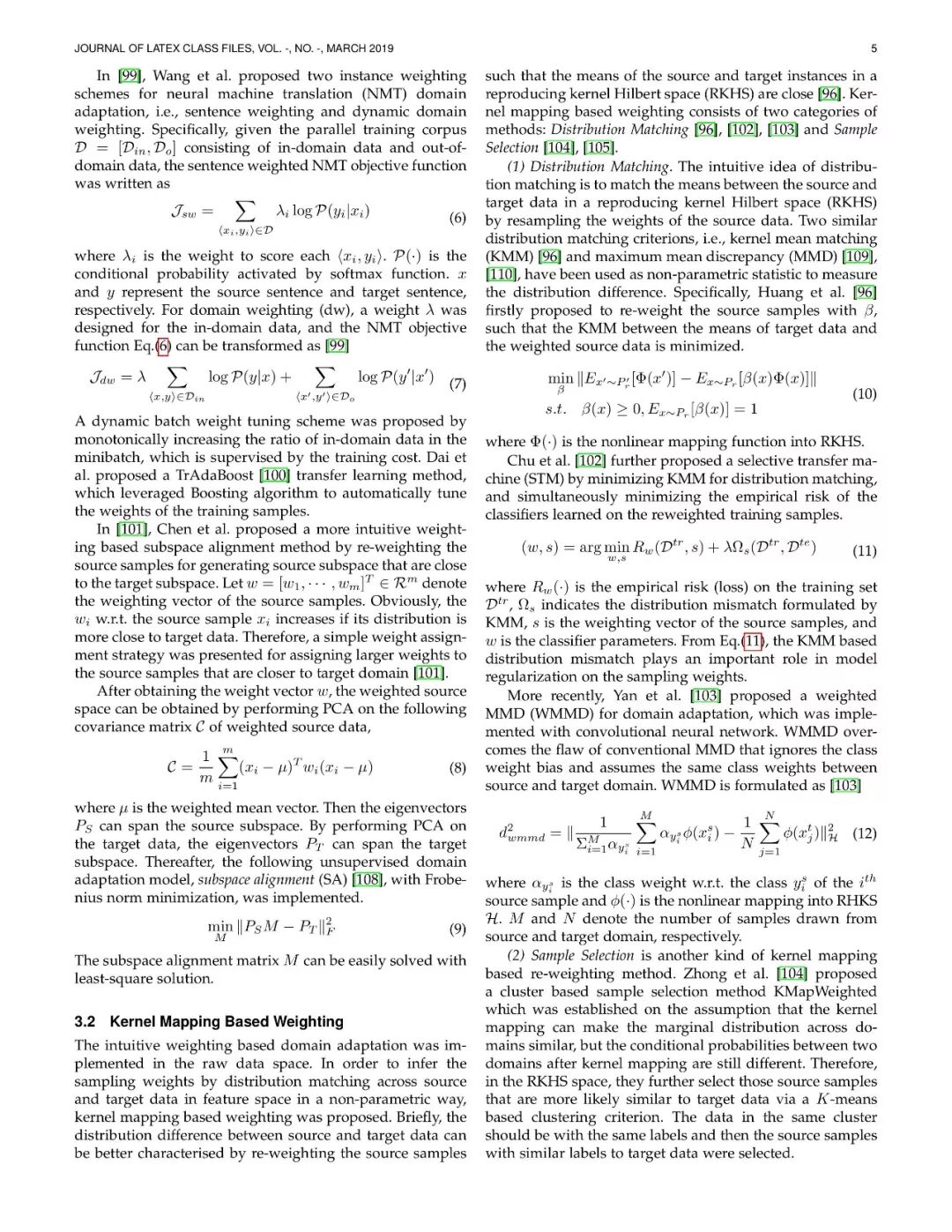 • Instance Re-weighting Adaptation。由于跨域数据间的概率分布差异,通过基于源和目标数据之间的特征分布匹配,以非参方式直接推断实例的重采样权重来自然考虑差异,参数分布假设下的权重参数估计仍然是一大挑战。