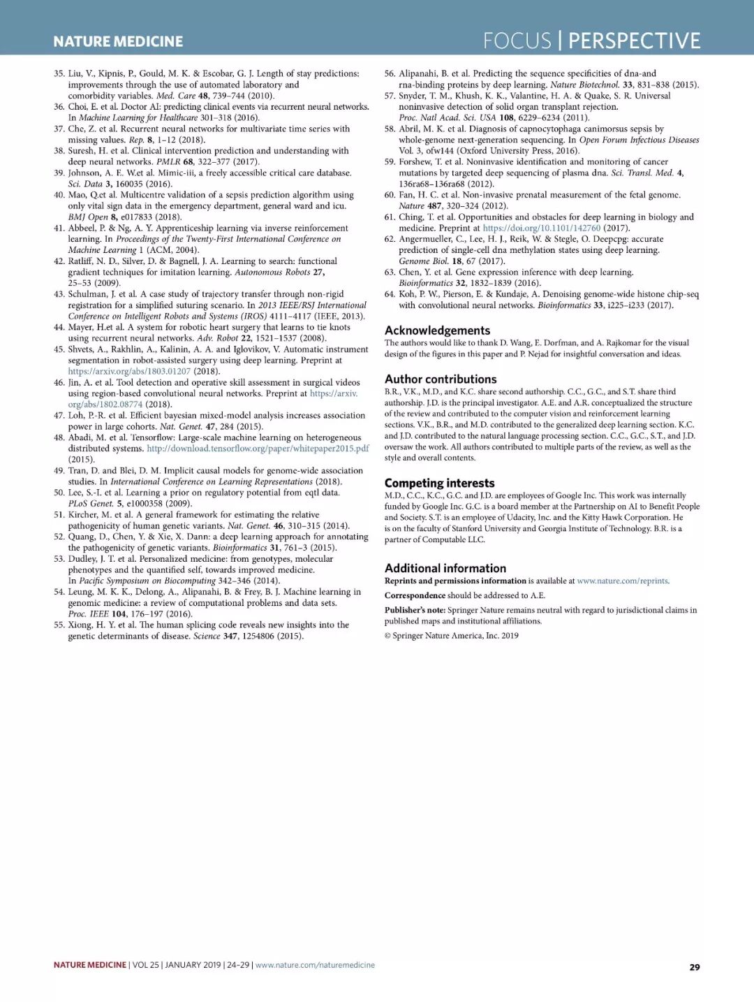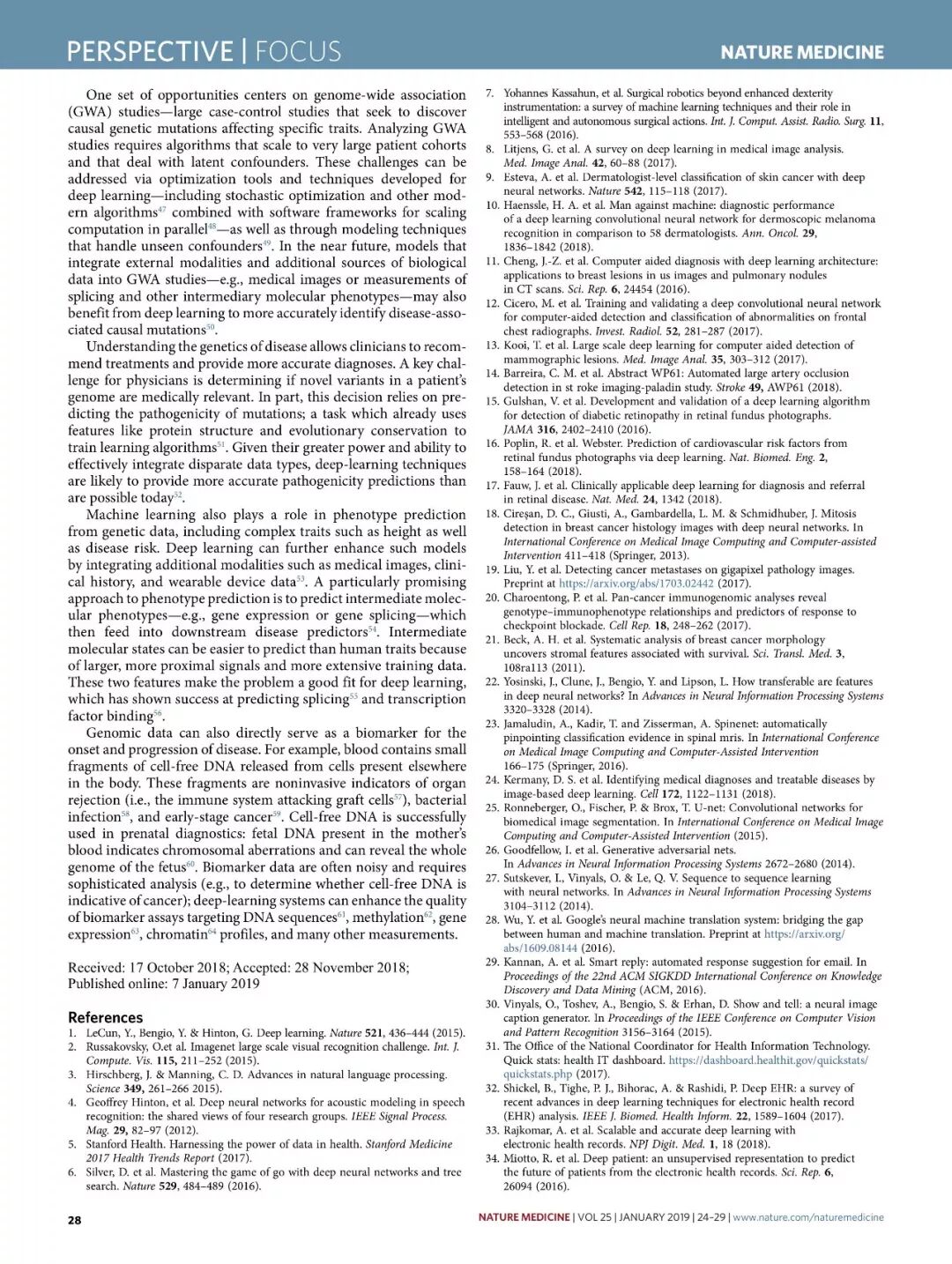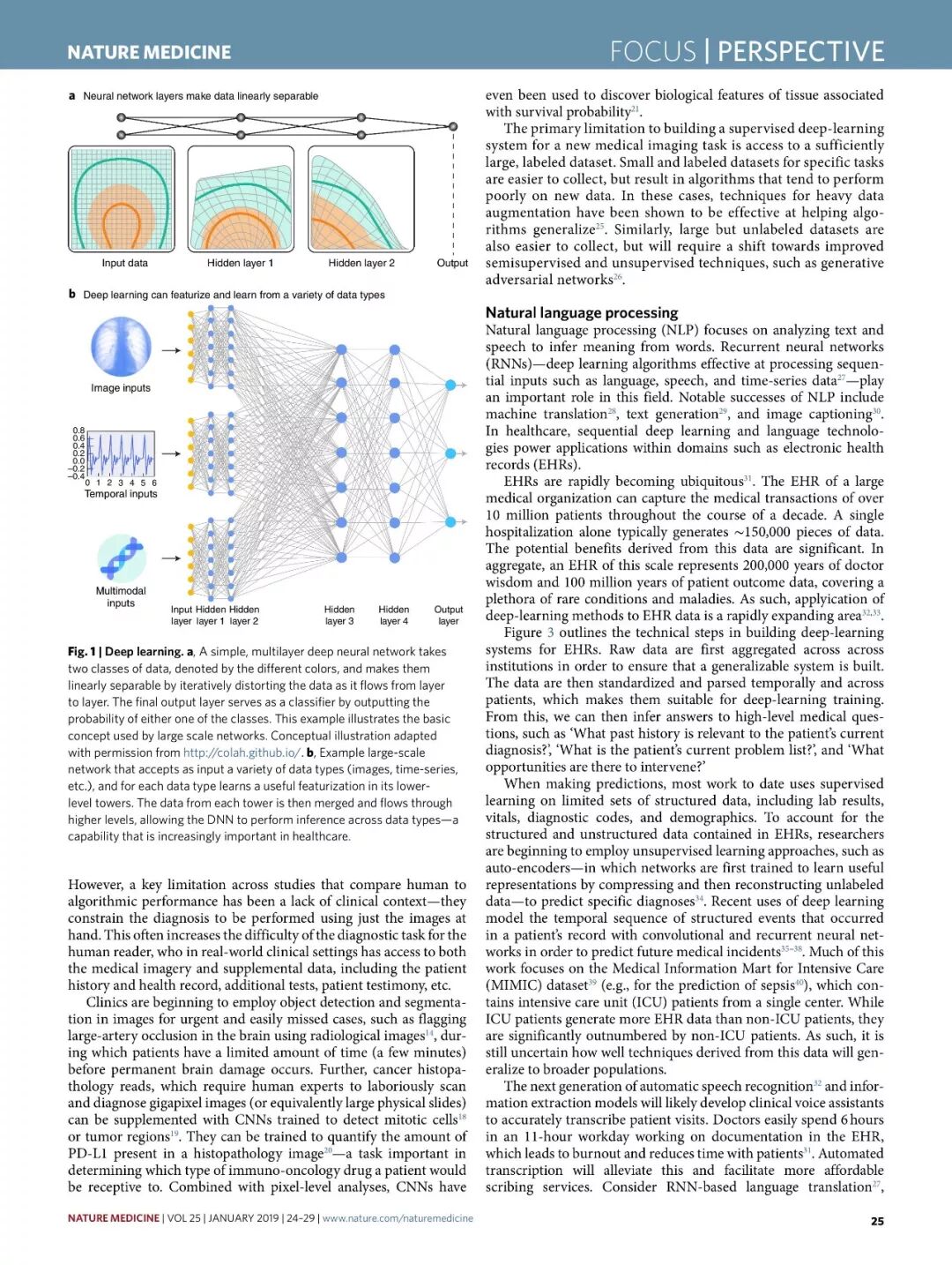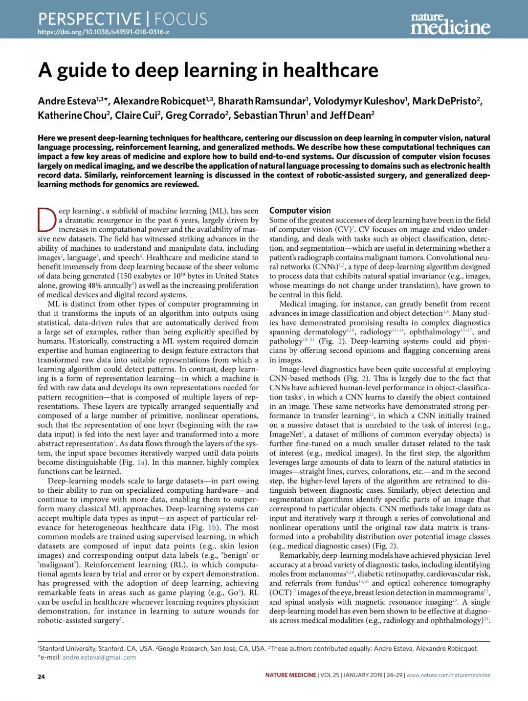 本篇文章介绍了深度学习技术对于健康领域的发展影响,并分别讨论了计算机视觉、自然语言处理、强化学习和广义方法几个方面。我们描述了这些计算技术如何对医疗领域中的关键问题产生影响,并且展示了如何构建端到端的系统。例如:计算机视觉技术应用于医疗影像处理;自然语言处理应用于电子健康信息;强化学习应用于机器人辅助的外科手术过程;广义深度学习技术用于基因领域。