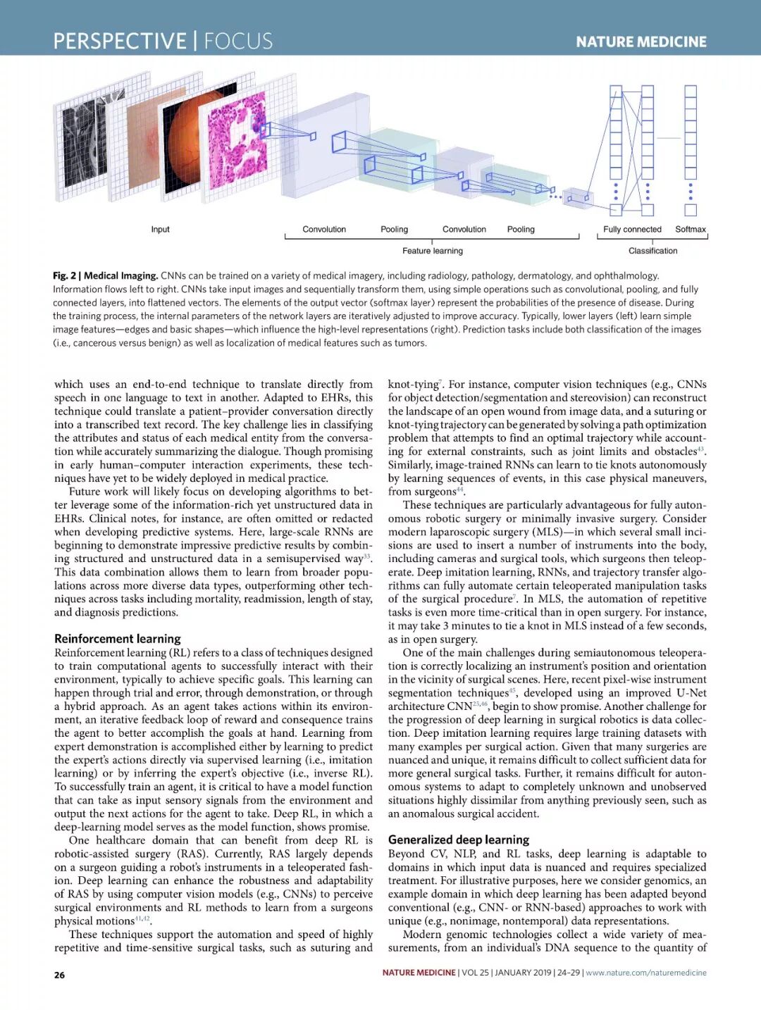 【导读】文章由斯坦福大学与Google研究组合作撰写,主要介绍了深度学习领域中各类方法在医疗领域中的应用前景,文章分别从计算机视觉、自然语言处理、强化学习、广义深度学习方法四个方面进行了阐述,具体内容如下。