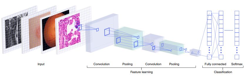 图:医疗影像中,CNNs可以在大量的医疗影像上进行训练,包括眼科、皮肤科、放射科等信息。CNN获取输入图像,并逐步对其进行变换,其中可能使用到卷积、池化、全连接层等算法。输出元素表示了各个类别可能的概率。