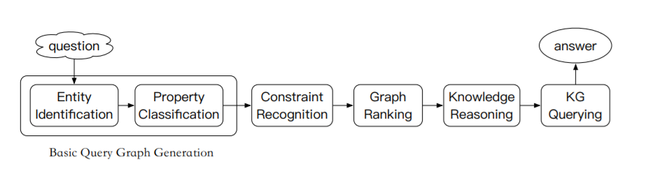 通过识别用户问题中的实体、属性、约束 ( CVT 子属性 ),将用户的问题转换成可能的多个候选图,然后对候选图进行排序,选择得分最高的图,根据情况进行推理改写,并最终查询 KG 返回相应的结果。在这个过程中,可能还需要进行推荐或者反问以应对语义不清或者问题不完整的情况。上图展示展示了 KBQA 的基本问答流程。