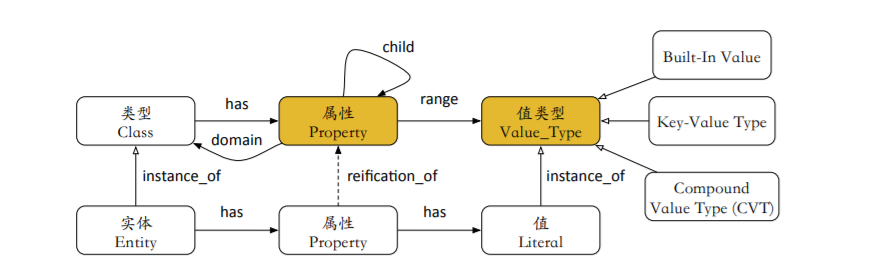 • 扩展经典的SPO结构来获取实际知识和问题: (1)我们使用属性层次结构来组织知识,而不是平坦属性,并指导模糊的问题;(2)采用键值结构和复合值类型(CVT)来描述复杂的答案,实现精确的问题回答。