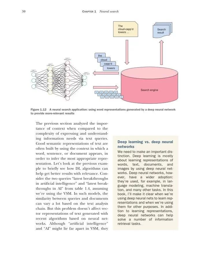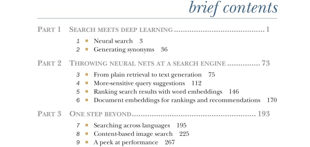 第1部分介绍了搜索、机器学习和深度学习的基本概念。第一章介绍了应用深度学习技术来搜索问题的原理,涉及了信息检索中最常见的方法。第2章给出了如何使用神经网络模型从数据中生成同义词来提高搜索引擎效率的第一个例子。