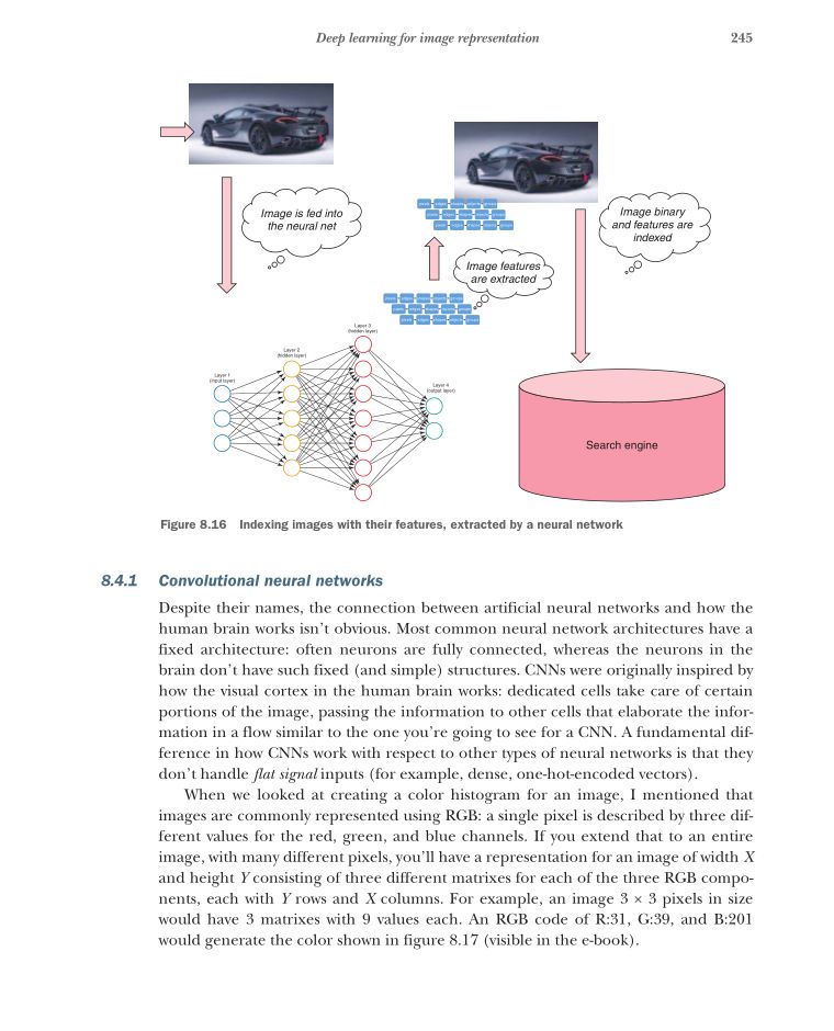 第3部分将介绍更复杂的场景,如深度学习机器翻译和图像搜索。第7章通过基于神经网络的方法为你的搜索引擎提供多语言能力来指导你。第8章讨论了基于内容的图像集合的搜索,并使用了深度学习模型。第9章讨论了与生产相关的主题,如微调深度学习模型和处理不断输入的数据流。