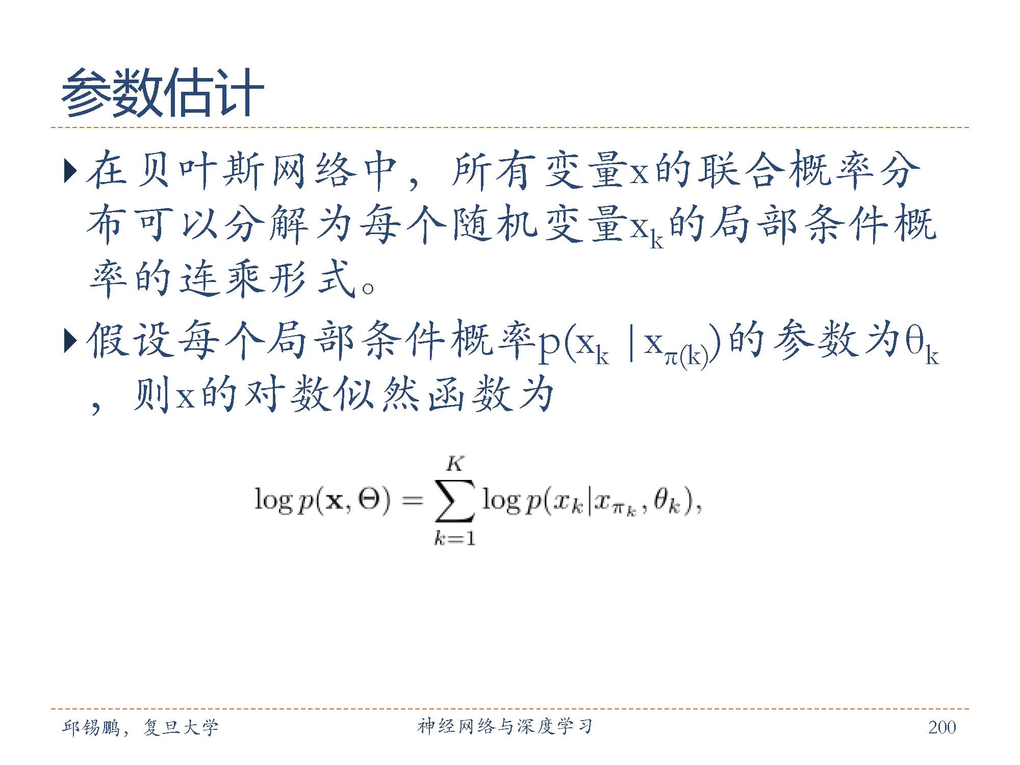 在贝叶斯网络中,所有变量 x的联合概率分布可以分解为每个随机变量 xk的局部条件概率的连乘形式。如图中的公式所示,通过最大化x的对数似然,只需要分别最大化每个条件似然。如果x 中所有变量都是可观测的并且是离散的,只需要在训练集上统计每个变量的条件概率表即可。