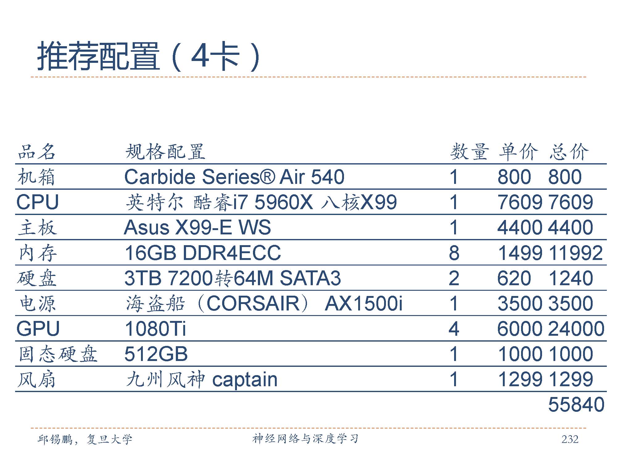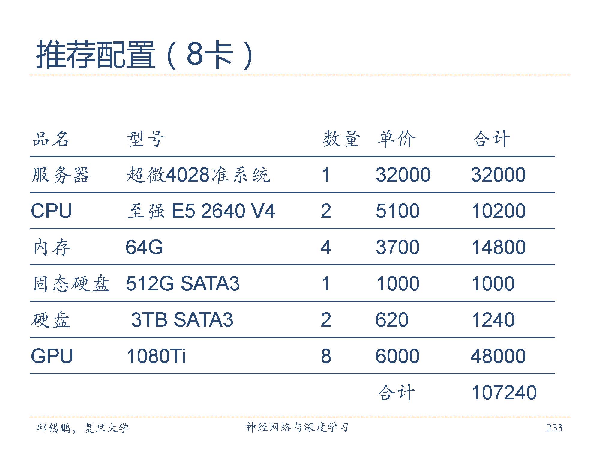 深度学习的实验一般要求比较高配置的服务器,邱老师在这里也推荐了两款配置,包括4-GPU和8-GPU两种配置。具体参数如图所示。