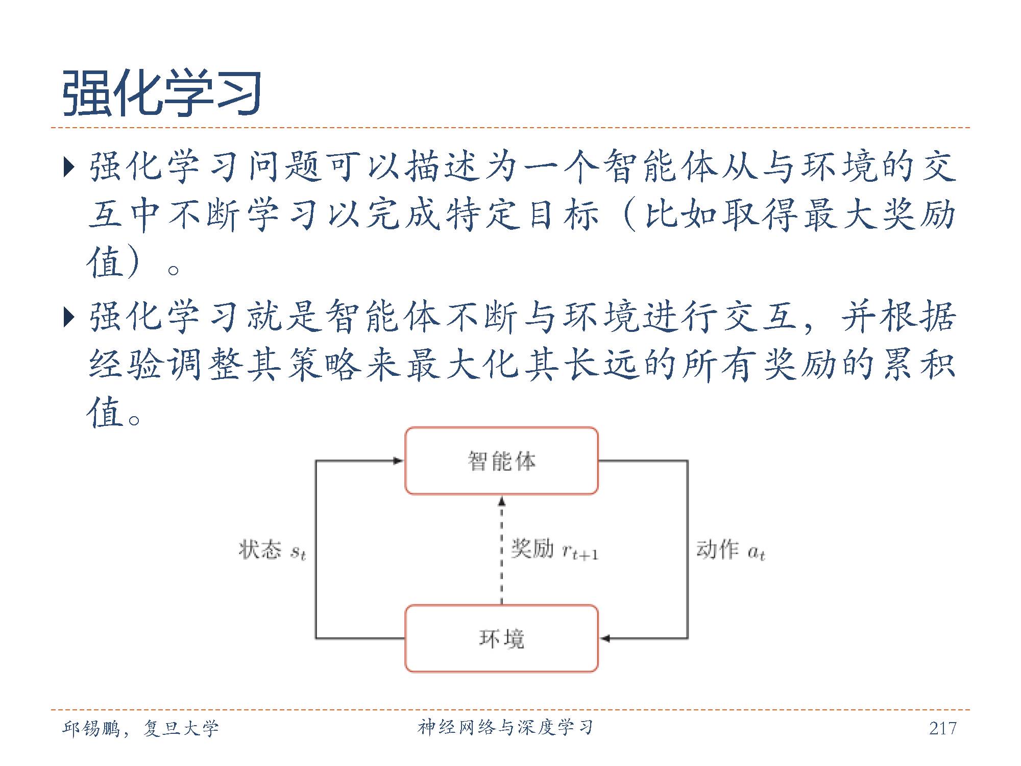 强化学习( Reinforcement Learning, RL),也叫增强学习,是指一类从(与环境)交互中不断学习的问题以及解决这类问题的方法。强化学习问题可以描述为一个智能体从与环境的交互中不断学习以完成特定目标(比如取得最大奖励值)。强化学习就是智能体不断与环境进行交互,并根据经验调整其策略来最大化其长远的所有奖励的累积值。和深度学习类似,强化学习中的关键问题也是贡献度分配问题 [Minsky, 1963],每一个动作并不能直接得到监督信息,需要通过整个模型的最终监督信息(奖励)得到,并且有一定的延时性。