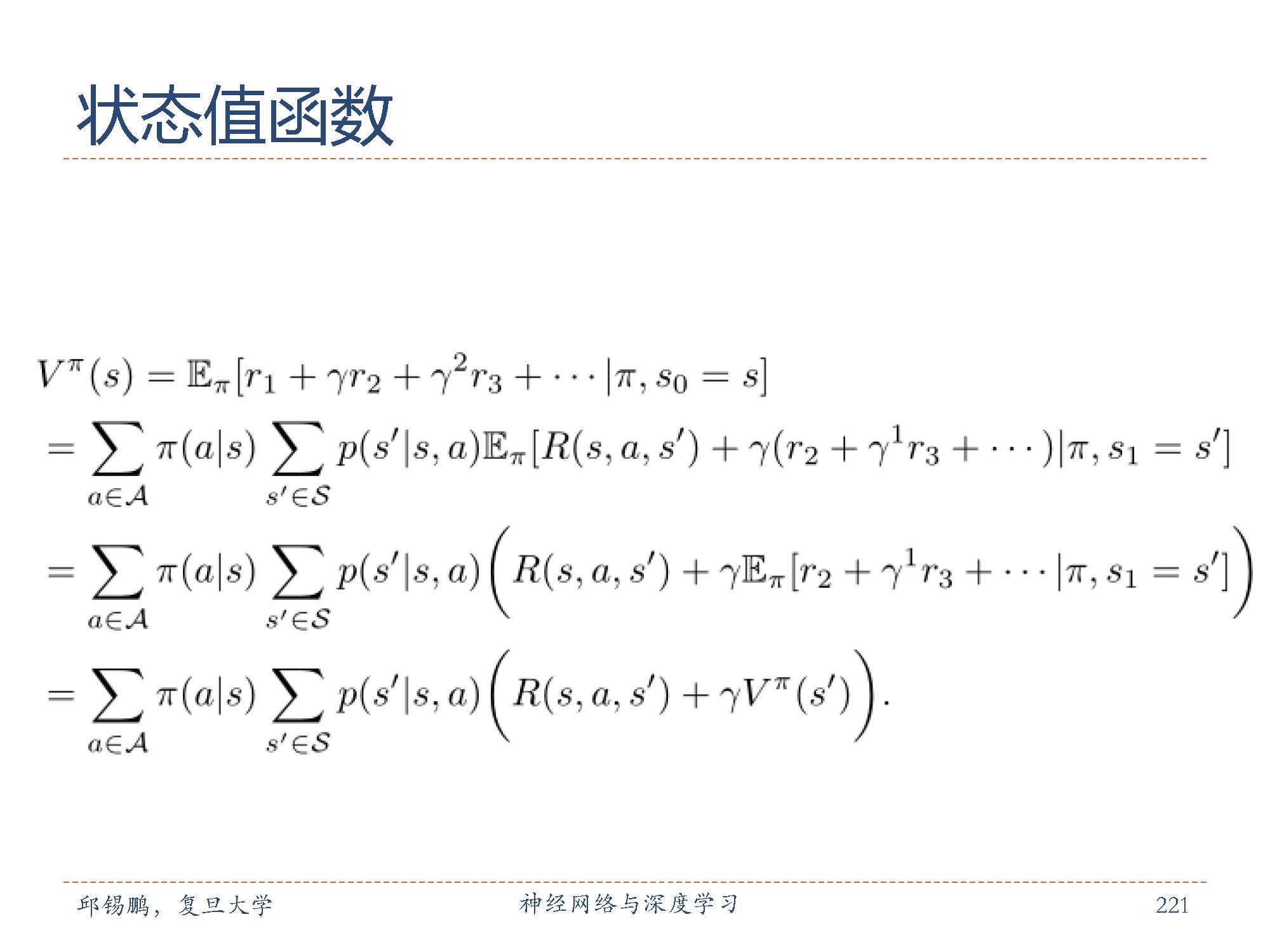 从状态s开始,执行策略π得到的期望总回报,如图中的第二个公式所示。