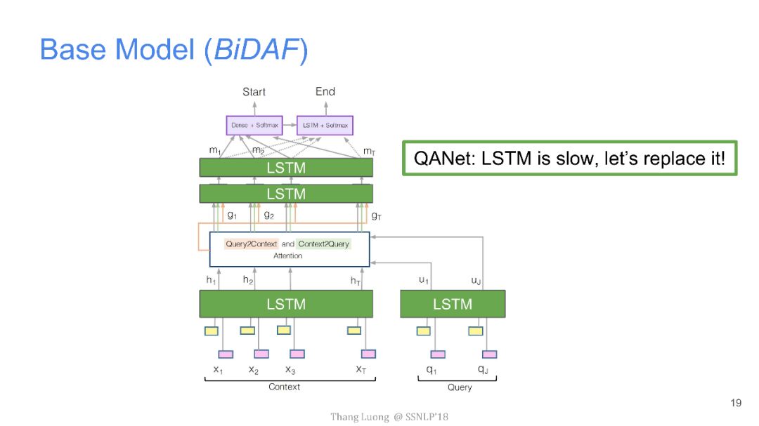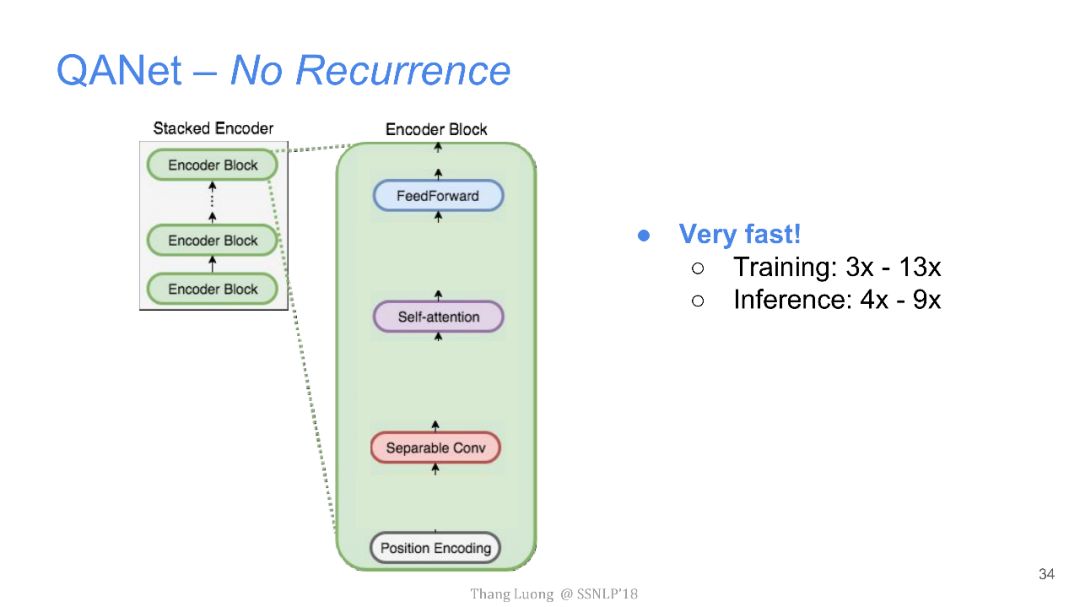 上图中是SQuAD当前的排行榜,直到近期,谷歌大脑团队和CMU联合推出QANet拔得头筹,将EM值提高到了84.454,F1值也提高到了90.490。并且,难得的是,与其他团队动辄10几个小时的训练时间相比,QANet仅仅需要45分钟的训练时间。