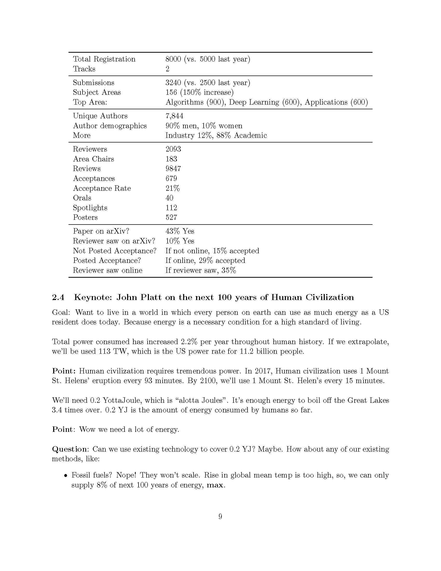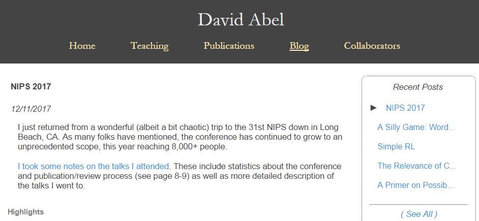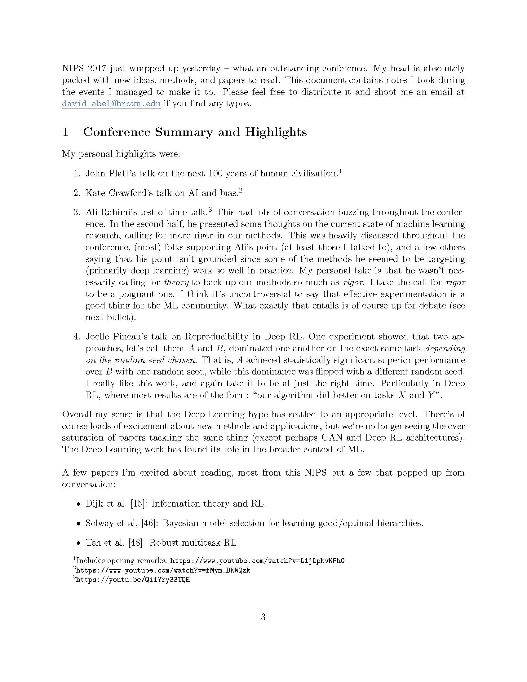 【导读】美国时间 12 月 4 日,第 31 届神经信息处理系统大会(Neural Information Processing Systems,NIPS)在美国加州长滩的会展中心正式开幕!今年参会人数达8000多人,在NIPS2017上,美国布朗大学计算机专业的博士生David Abel在其个人博客网站上写了长达43页的笔记总结,主要是介绍了他在会议期间记录的一些talk的笔记,主要是关于会议和review过程的一些统计(详细信息在报告的8-9页),以及对他自己参加一些报告的细致地回顾。专知内容组整理出David Abel的notes分享给大家!