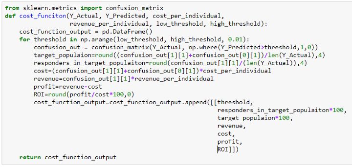 上述函数以“实际结果”,“事件发生的预测概率”,“每个人的成本”,“每个人的收入”,“检查的概率范围”作为输入。 下面的代码调用上述函数,将训练数据作为输入,并估计每个人的成本和收入,来进行决策。